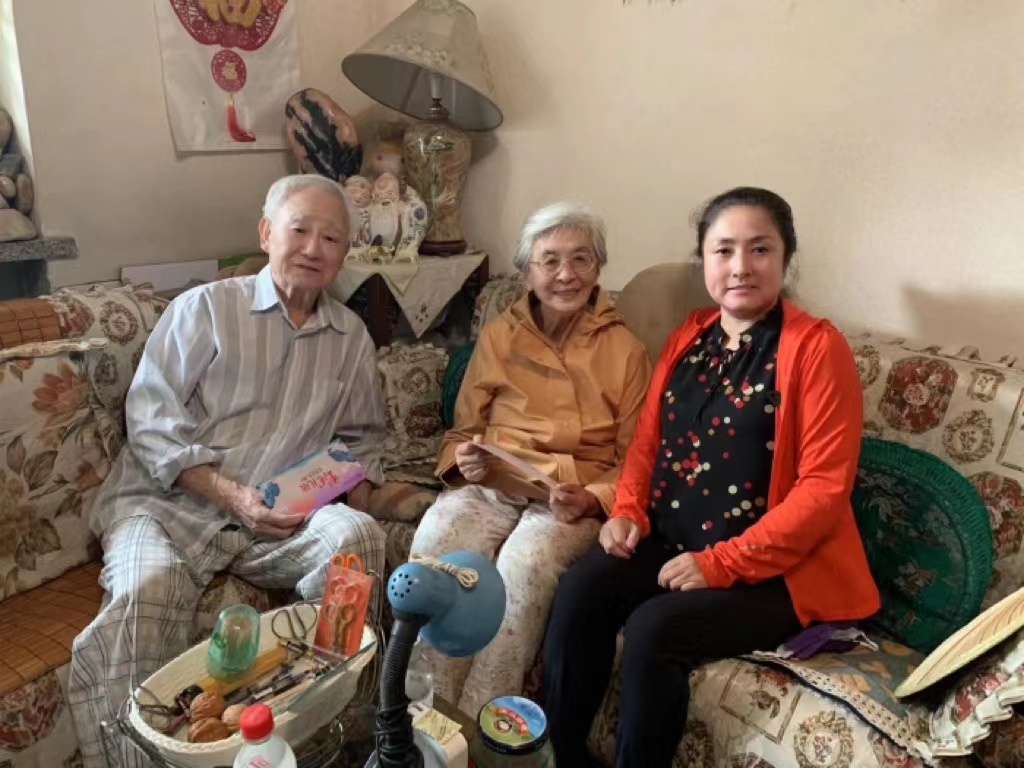 党委书记曹海翔(左一)和党委副书记兼工会主席张洁(右一)慰问老同志