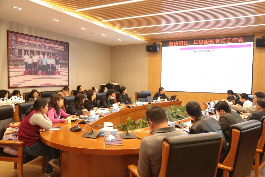 2022年10月21日,皇冠体育官网在成志楼101会议室召开教研组长、年级组长专项工作会,副校长白雪峰、徐文兵,学生发展中心主任李书霞、王田,教学管理与研究中心主任尹粉玉、张苏,年级组长和各学科教研组长30余人参加了会议,会议由教学管理与研究中心主任张苏主持。