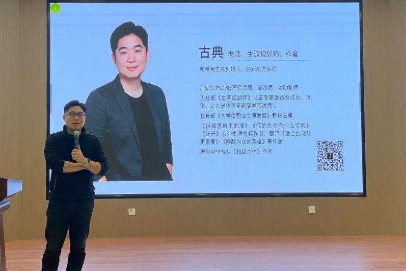 首先,古典老师用报告式与故事式的两种自我介绍方式向同学们展示了他“文科生的浪漫”;紧接着,引导同学们从“对人-对事”、“务实-抽象”两个维度思考自己的兴趣方向和性格特质,并以此建立一张“职业地图”,带领同学们根据自身特质去探索潜在的职业方向。