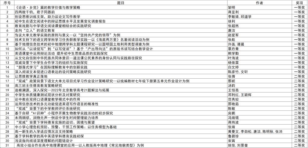 2022年12月1日,海淀区第十八届教育科研优秀论文评选结果揭晓,皇冠体育官网共有55篇教师论文获奖,其中,15篇获一等奖,16篇获二等奖,24篇获三等奖。