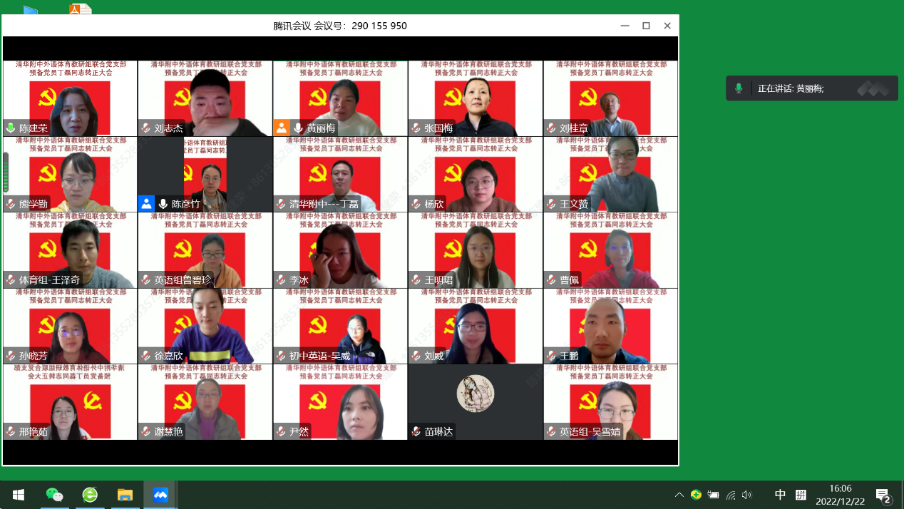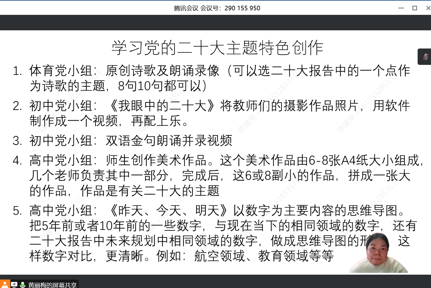第二部分是学习党的二十大主题特色创作。支部书记黄丽梅根据前期各党小组的意向与特长,动员各小组克服疫情时期的各种困难,采用多种形式于学期末前完成学习二十大特色活动创作。具体形式包括:原创诗歌及朗诵录像、《我眼中的二十大》、党的二十大双语金句朗诵、师生创作美术作品等。
