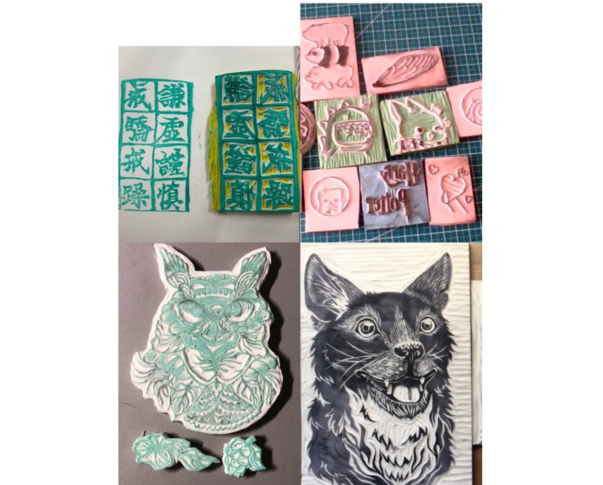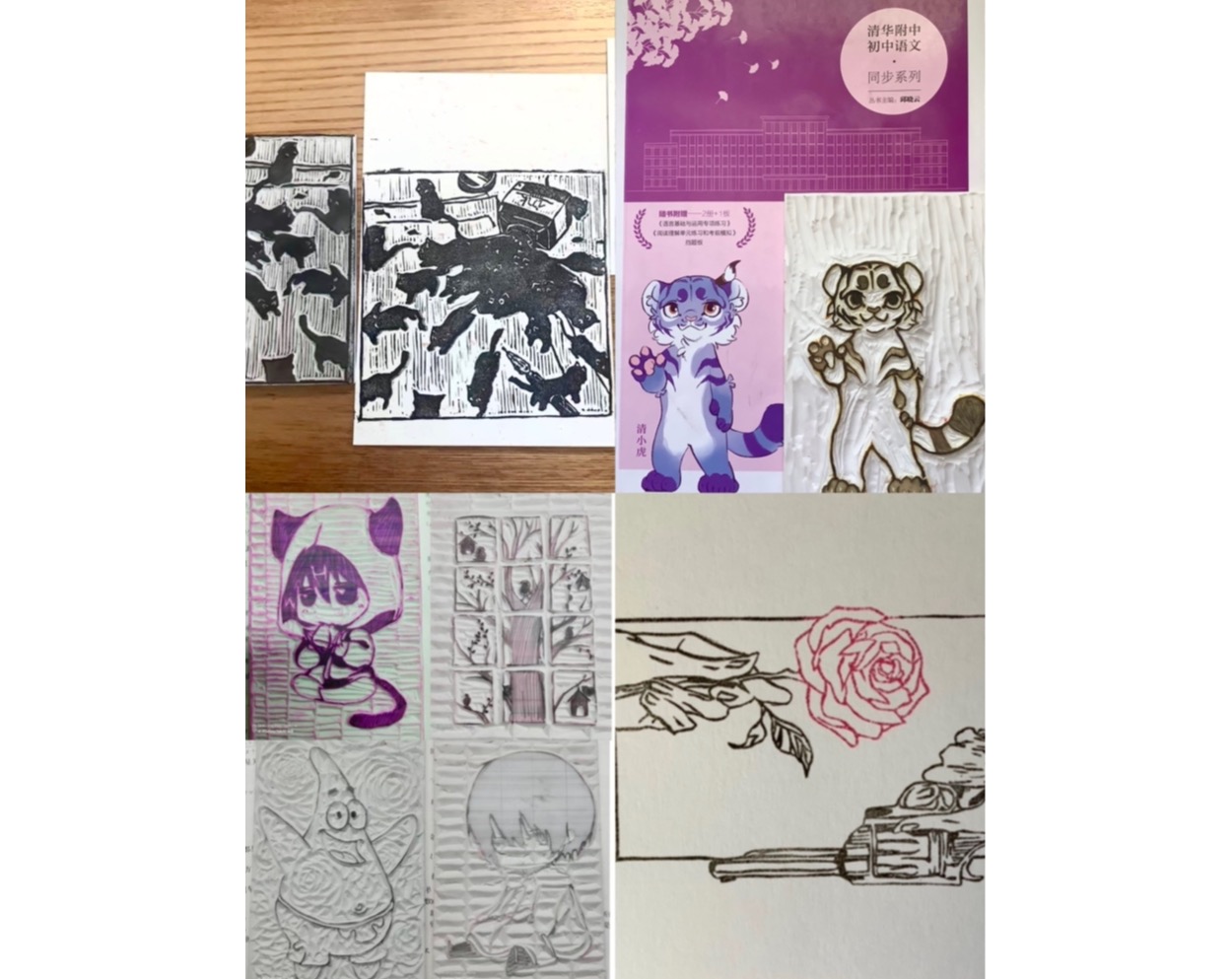 美术备课组设计了美术特色课程“橡皮章版画的制作”。赵滋教师首先讲授了国内外版画作品鉴赏课程,之后同学们积极的准备版画所需的工具与材料,参与到了橡皮章版画的制作中,线上美术课上初21级的同学们用刻刀雕刻版面实时发送和展示自己的制版过程,经过老师的分析与指导后,创作出一件件精美的版画作品。