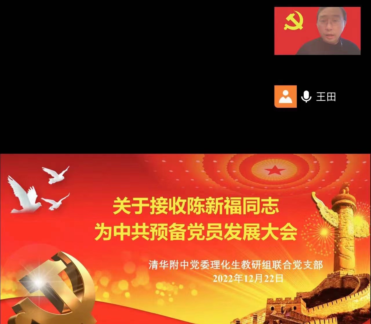 12月22日下午4点,理化生教研组联合党支部通过腾讯线上会议的形式召开接收陈新福同志为预备党员大会。会议由党支部书记王田老师主持,全体党员及部分积极分子共同参加。本次大会应到会党员39名,实到会39名,其中有表决权的正式党员39名,有表决权的正式党员实到会人数超过应到会正式党员人数的一半,符合规定人数。