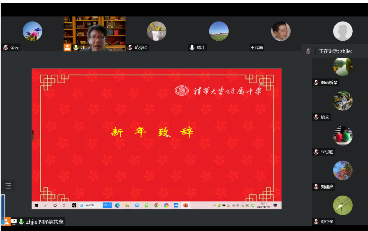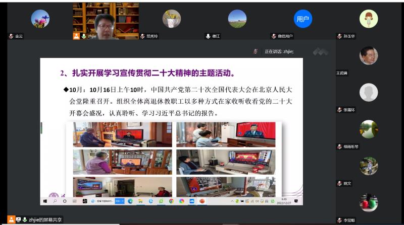 张洁老师对2022年离退休工作进行了总结汇报。报告中回顾了学校一年来克服疫情的影响下组织全体老同志同心战疫、党建、文体活动及生活服务等方面所做的一系列工作,充分肯定和感谢了一年来各位离退休党支部书记、片组组长、兴趣队长带领全体老同志共同取得的成绩,并鼓励大家再接再厉,争取新的成绩。同时,张洁还传达了清华大学党委、离退休处和附中对离退休同志健康状况的深切关心,详细介绍了学校克服困难针对老同志做好防疫、看病就诊方面的特殊关照措施,对老同志做好近期防疫进行多方面的提醒,希望全体人员携手抗疫,共赴时艰。此外,张洁老师还对2022年离退休党建工作做了总结。