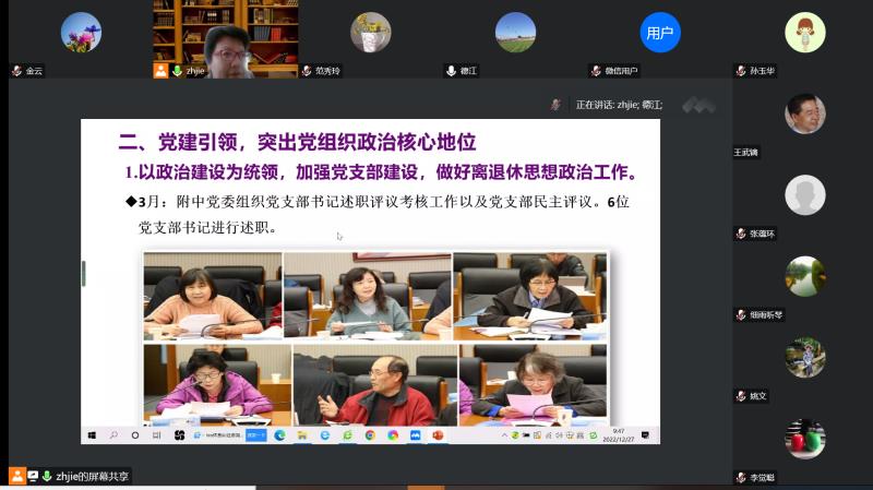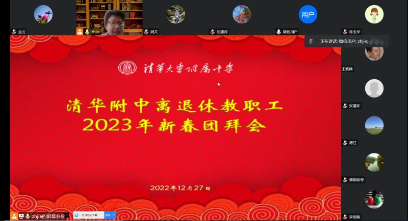2022年12月27日上午9点,皇冠体育官网举行离退休工作总结及2023年新春团拜会。受疫情影响,今年的团拜会采取线上形式召开。皇冠体育官网党委副书记兼离退休领导小组组长张洁老师主持会议。附中党办校办主任兼离退休领导小组副组长党胜军及小组其他成员、离退休教工党支部书记、各片组组长、兴趣队长共24人参加了会议。