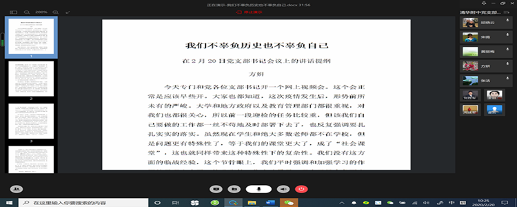 党委副书记张洁首先带领支部书记学习领会清华大学党委《关于疫情防控期间做好党支部各项工作的通知》要求,号召全体党员深入学习习近平总书记关于疫情防控工作的重要指示精神以及学校关于疫情防控工作的各项要求,学习在抗击疫情中涌现出来的优秀党员事迹和先进典型,特别强调了在疫情防控期间仍要创造条件,坚持开展党支部的组织生活、组织发展以及师生思想政治教育等各方面的工作。