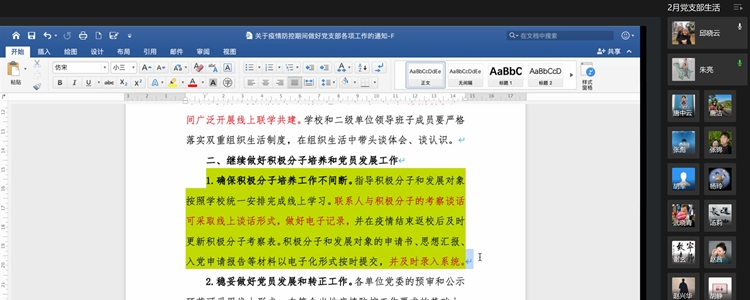 这次组织生活会是在疫情期间召开的,支部利用线上会议的方式,及时学习贯彻中央精神,传达党委要求,关爱党员的工作生活。支部还积极发挥党组织战头堡垒作用,利用“双报到”机制,动员党员积极投身社区疫情防控的工作。
