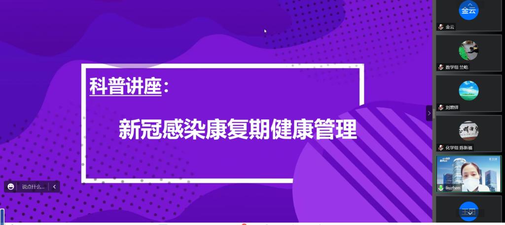 理化生教研组联合党支部邀请北京泰康燕园康复医院刘震主任做科普讲座《新冠病毒感染恢复期健康管理》,重点介绍了恢复期的康复建议、长途旅行和返岗工作相关,以及如何预防二次感染。各党支部共享收听。