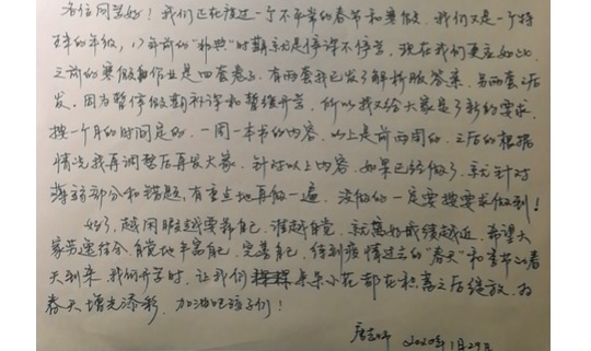 教学的同时,不断在微信里鼓励孩子们,面对疫情,积极调整学生的精神状态。如,在大年初五,唐秀梅老师在给同学们布置作业、提出要求的同时,给孩子们写了一封信,激励学生们。学生和家长们都很感动!
