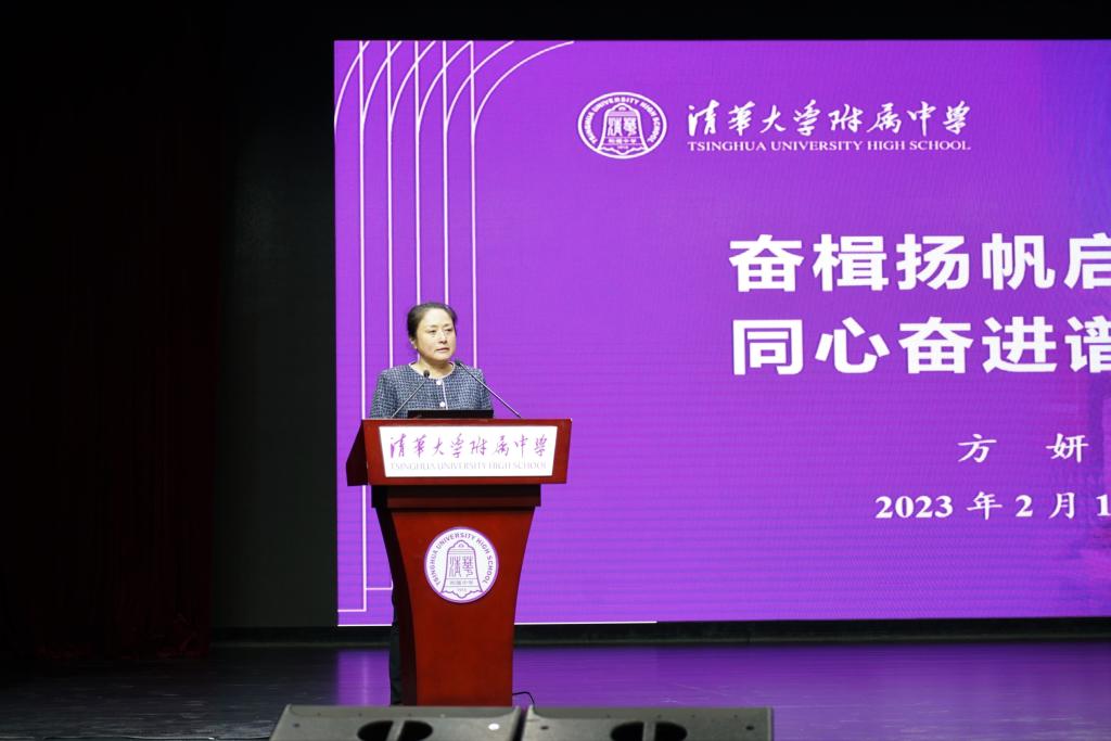 最后,校长方妍做题为《奋楫扬帆启新程 同心奋进谱新篇》的闭幕式讲话。她首先特别肯定了全体教职工以务实求真的态度积极为学校建言献策,将学校的发展始终放在首位的精神,并就一些具体问题进行了直接的回复和说明。在全面介绍新学期学校在学生发展、教学提升、教师成长、服务保障、国际教育等方面的工作展望之后,方妍强调,2023年是全面贯彻落实党的二十大精神的开局之年,也是实施“十四五”规划承上启下的关键之年,附中人应将教育初心与育人理念切实地融合到具体工作中,抓住机遇,勇立潮头,绘就蓝图,实干为要,以全体之力共谋学校的高质量发展。