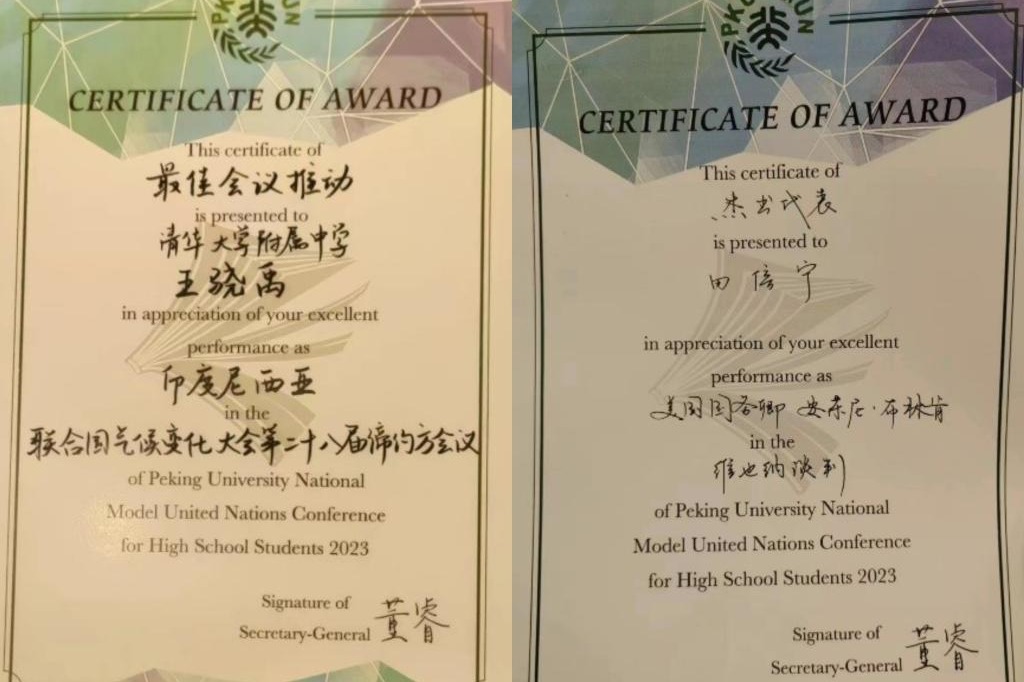 这次北京大学全国中学生模拟联合国大会,有幸作为印度尼西亚代表参与COP28联合国气候变化公约缔约方第28次大会。我们众多国家和企业代表、媒体自由撰稿人聚集在会场中,用七个会期对协力促进绿色经济发展这一议题进行深入讨论。要是说这次模联会议给我印象最深之处,莫过于与全国各地优秀高中生的交往,我们尝试与各种风格,看法不同的人打交道。我绝对永远忘不了这四天的日夜,会议思路的争论,各方立场的矛盾,迟迟没有开始讨论的冲突部分,以及灵光乍现对于核心平台搭建部分的速通,尤其是我们写文件效率受到主席表扬后信心剧增和坚定立场的决心。——王骁禹