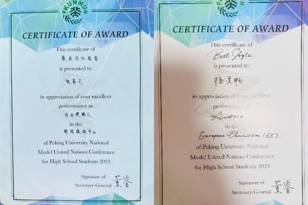 参加北京大学全国中学生模拟联合国大会之后,我的模联生涯也接近尾声,回想去年北京模联暑期研讨会的生疏与青涩,如今我也终于成为了能运筹帷幄,游刃有余的模联人。尽管会议期间为接连不断的动议手忙脚乱,为合作决议草案时众口难调而一筹莫展。但一切终将过去,当我们的决议草案终于通过时,我心中的喜悦溢于言表。在短暂的模联生涯中我深刻认识到了团结的困难度与重要性,分歧总是难以避免的,但友谊历久弥坚。总而言之,参加模联带给我的远不止这些。家园已在身后,世界尽在眼前。——李依宸
