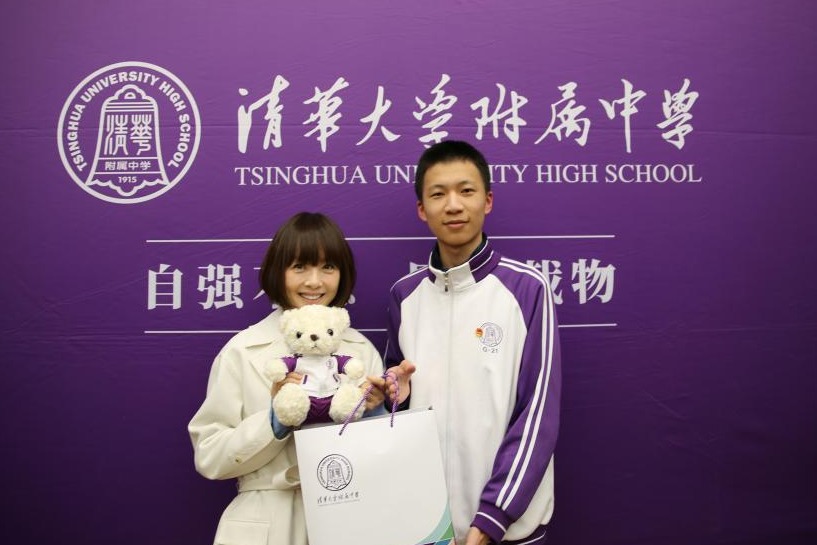 李佩达同学向陈鲁豫校友介绍校园环境