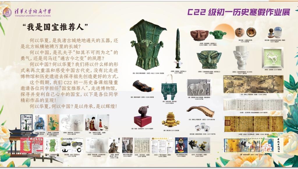 3月9日,“我是国宝推荐人”皇冠体育初22级历史寒假优秀作业在华茂楼208门前展柜进行展览,并配套展板在初中教学楼前展示。本次展览得益于教学管理与研究中心主任张苏、资源保障中心副主任魏兵的大力支持,历史教研组组长宋薇、初一年级组长熊学勤老师的指导与协调。