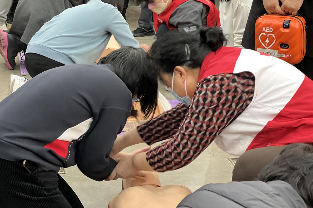 讲解结束后,红十字会多位老师分组带领家长们按顺序进行了包括前期判断(是否丧失意识、有无自主呼吸、颈动脉是否搏动)、徒手施救(CPR)(实施胸外心脏按压、清理口腔异物、开放气道、人工呼吸)、AED使用这三项重要的急救流程模拟操作。