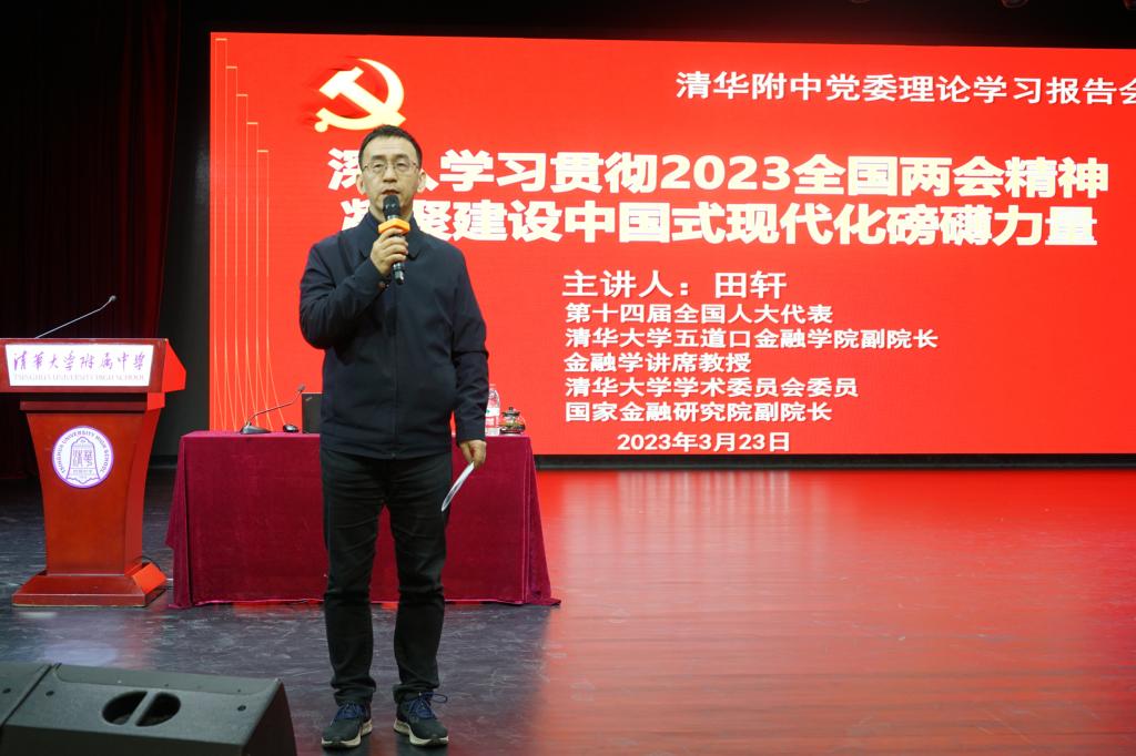 3月23日下午,皇冠体育官网党委组织全校教职工学习2023年全国两会精神。第十四届全国人大代表、清华大学五道口金融学院副院长田轩受邀作题为《深入学习贯彻2023全国两会精神,凝聚建设中国式现代化磅礴力量》的专题报告。报告会由皇冠体育官网党委书记曹海翔主持,学校全体教职工及业余党校学生共四百余人参加学习。