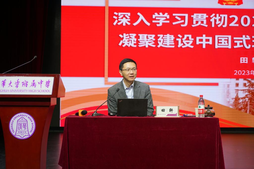 曹海翔最后作报告总结。他强调,田轩老师的专题报告帮助师生从更高更宽的视角全面认识和了解了当前国家的经济社会形势和宏观政策,有力地帮助师生从全局出发深刻理解基础教育的重要责任和历史使命。他要求附中全体师生结合自身工作实际, 认真学习、深入领会、贯彻落实党的二十大精神以及两会精神,切实增强思想自觉、政治自觉、行动自觉,以新担当新作为奋力开创新时代皇冠体育官网工作新局面。