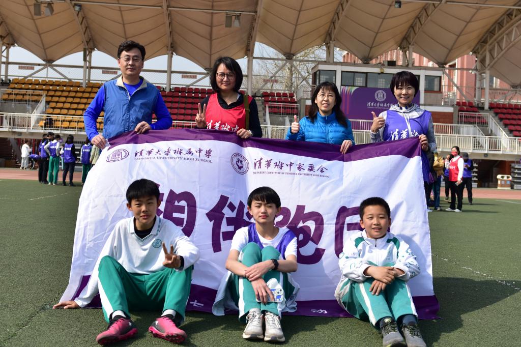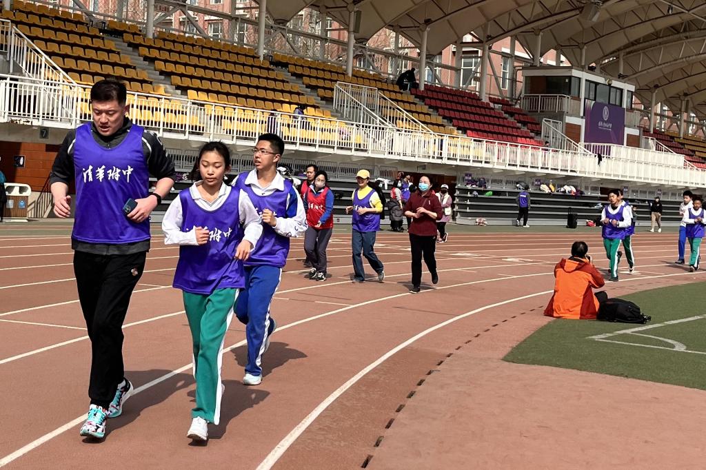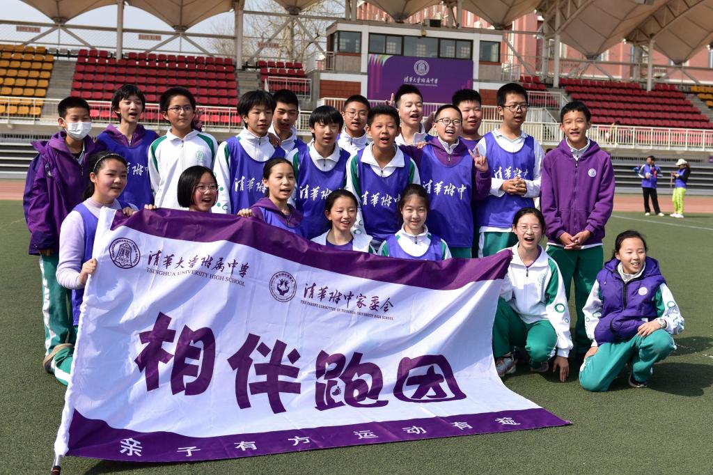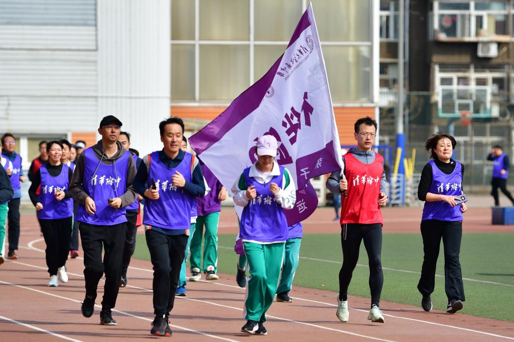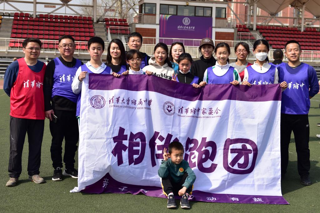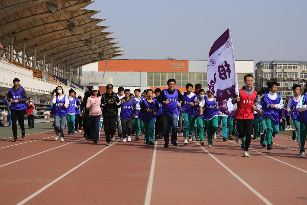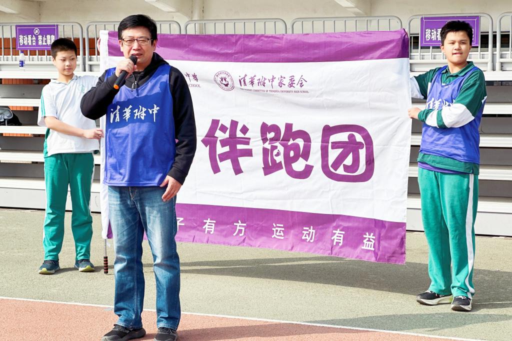 充满仪式感的倒计时后,活动正式开始。领跑志愿者手持新设计的跑团旗帜率先出发。白雪峰副校长和学生发展中心主任王田步履矫健,带领参赛家庭在春意盎然的附中操场上,畅快奔跑起来。