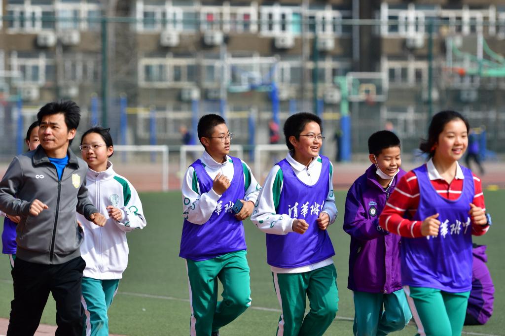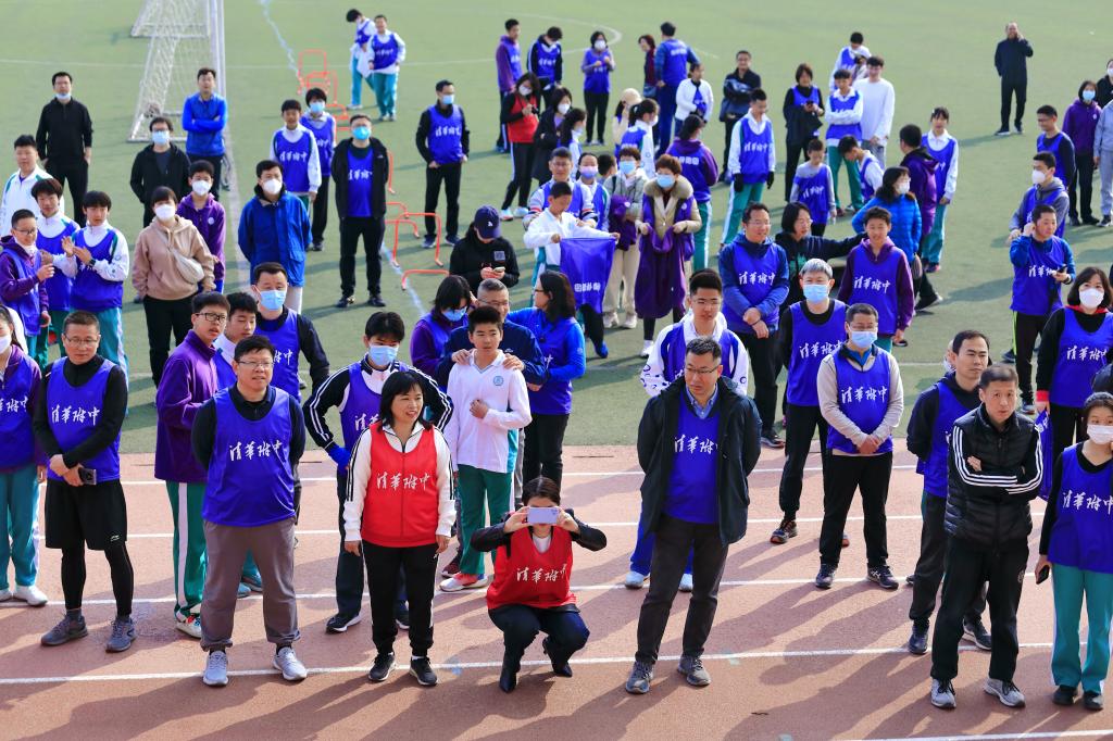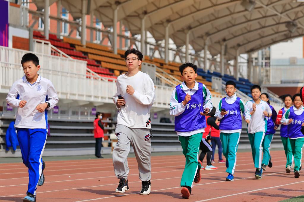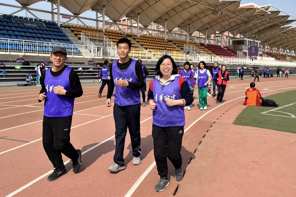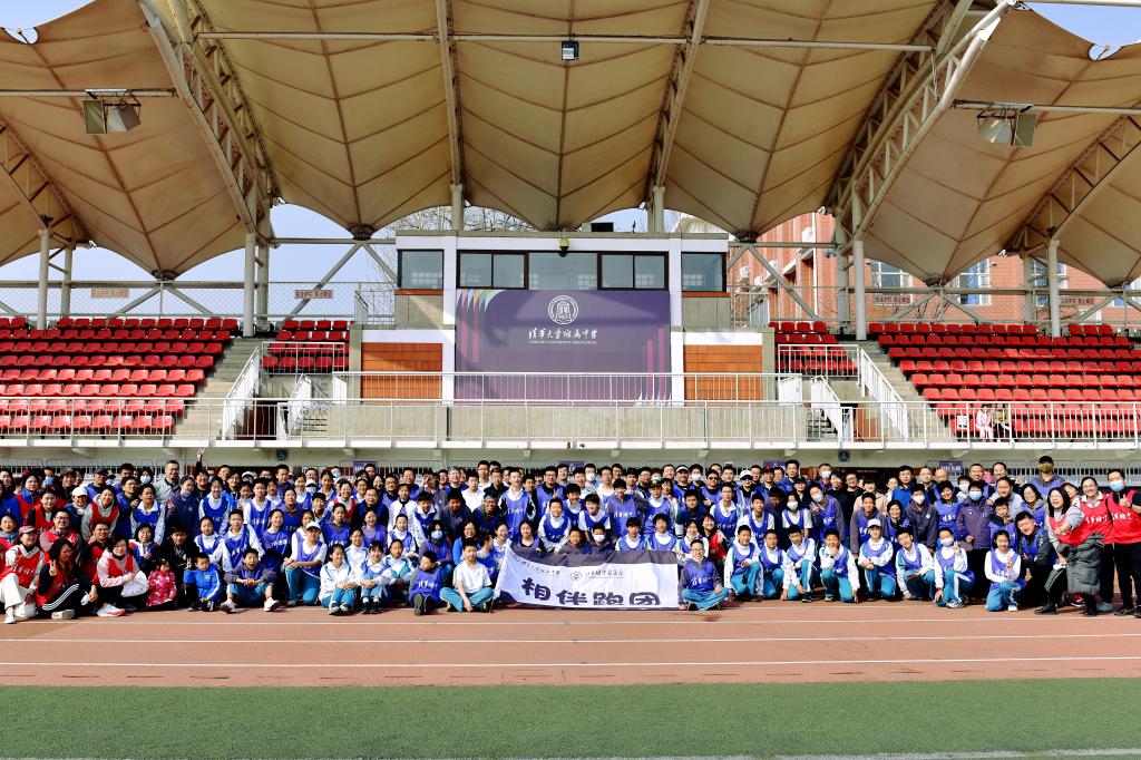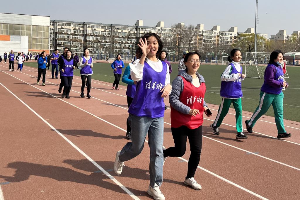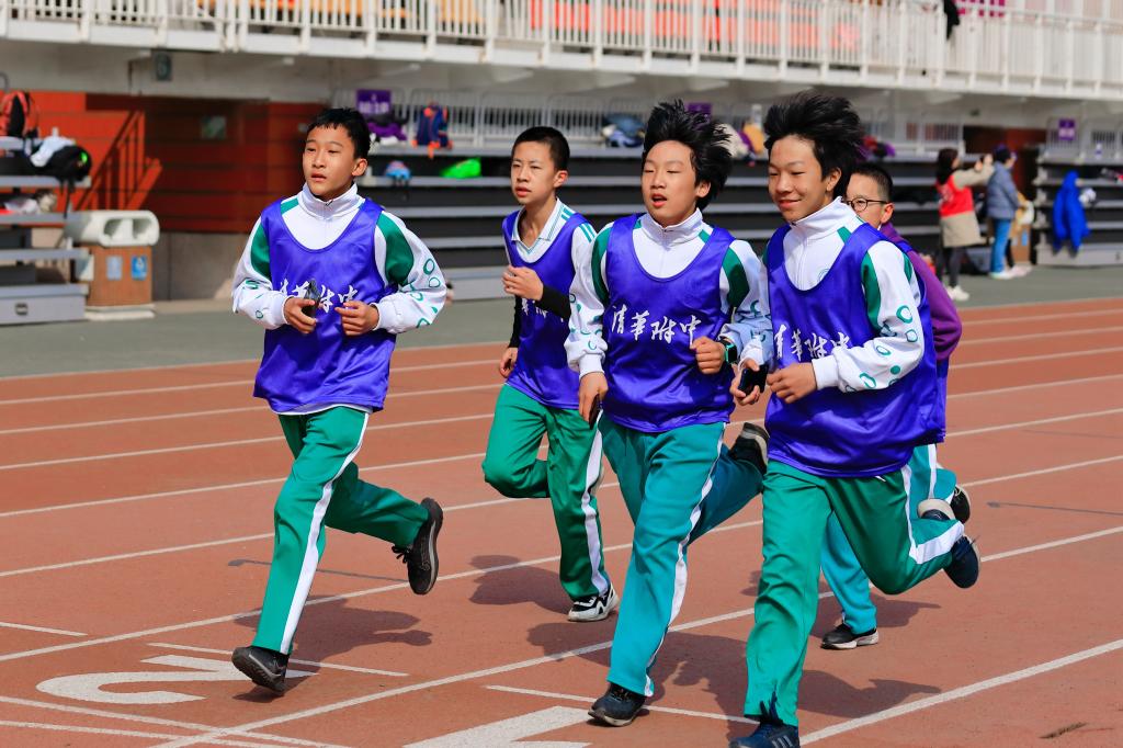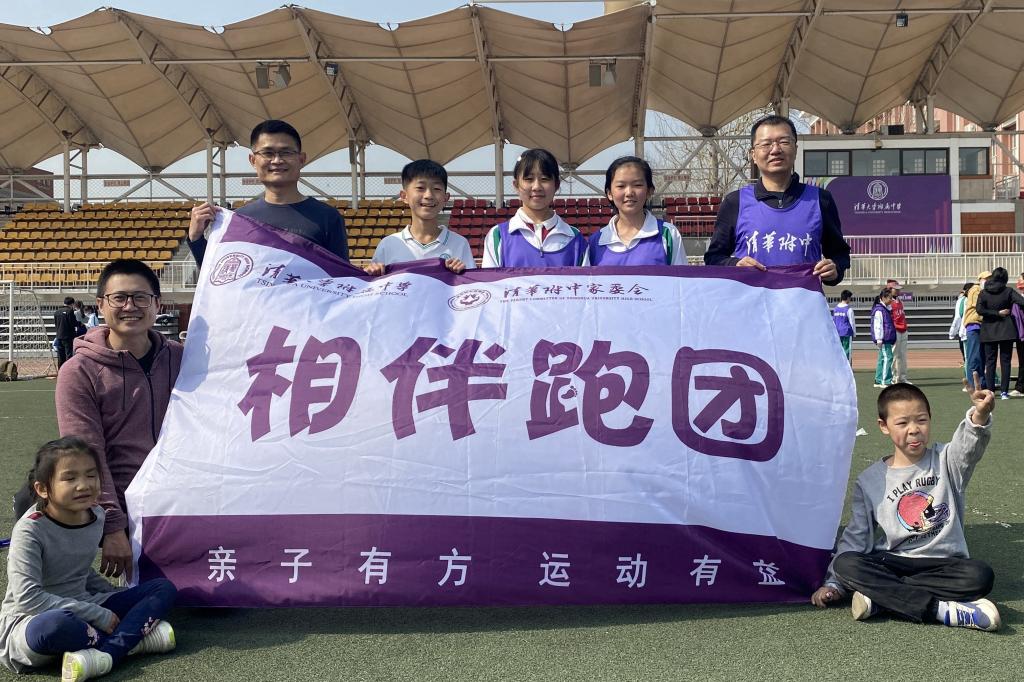 充满仪式感的倒计时后,活动正式开始。领跑志愿者手持新设计的跑团旗帜率先出发。白雪峰副校长和学生发展中心主任王田步履矫健,带领参赛家庭在春意盎然的附中操场上,畅快奔跑起来。