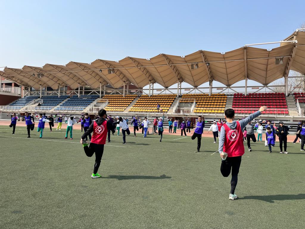 上午十点,活动正式开始。现场数百名参与者满怀期待,跃跃欲试。为了保证安全,参赛家庭首先进行了热身。在领跑志愿者的示范带领下,大家齐齐高抬腿、压弓步、拉伸韧带,现场充满运动活力。