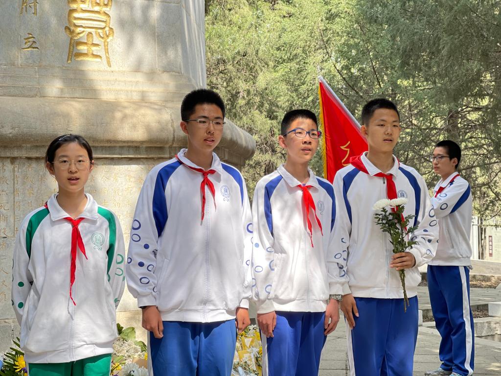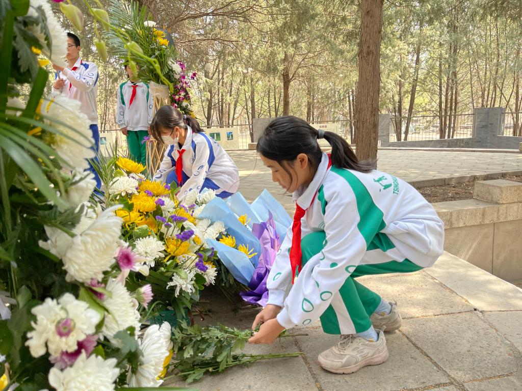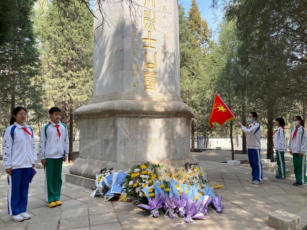 离开前,队员们在纪念碑前绕行一圈,敬献鲜花。最后,在无尽的哀思中,在场师生目送少先队队旗缓缓离开纪念碑场地,但爱国主义情思和革命先烈的崇高精神已在队员们心中深扎。