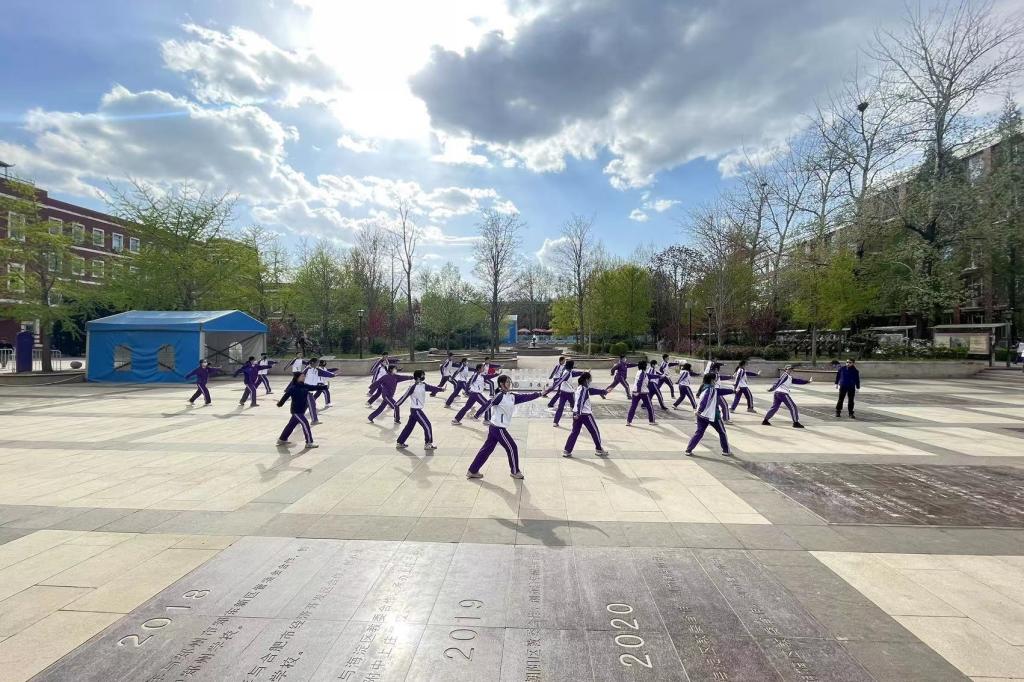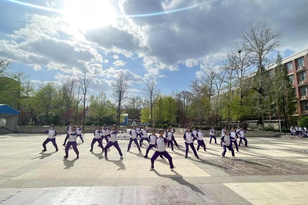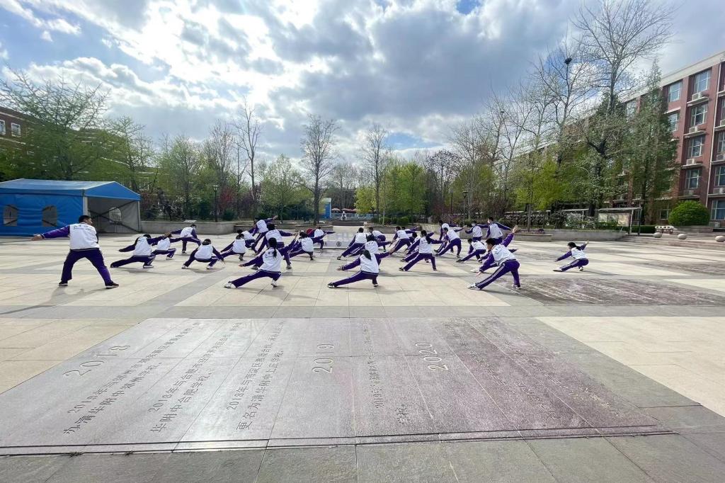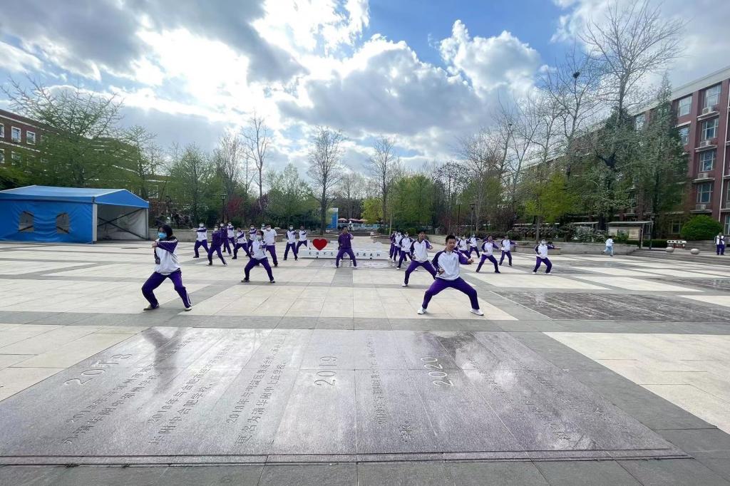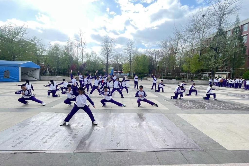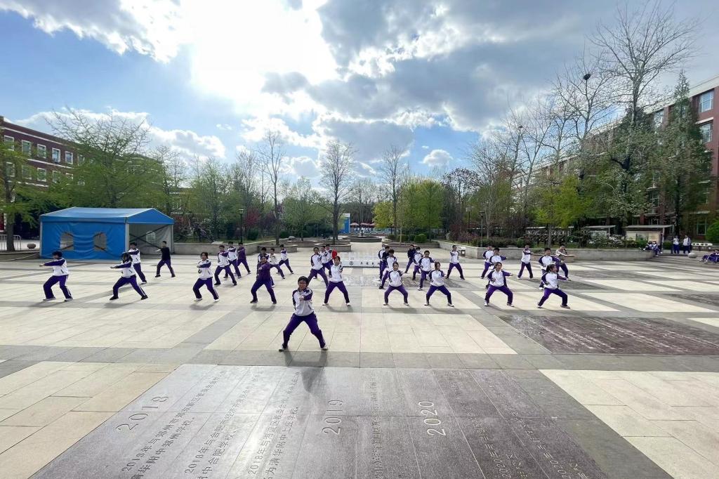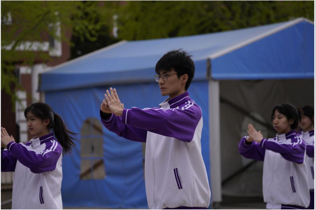 2023年4月6日,高二年级全体同学在银杏林前的下沉广场上参加了一场展现青春风采的“武林大会”,他们伴着音乐,打起形神拳,为校园带来了青春的气息。高二年级的全体教师也到场观赏表演,他们为同学们加油喝彩并投出自己心目中最佳的五个班级。高二10班的王彦鲁同学承担了解说的工作。