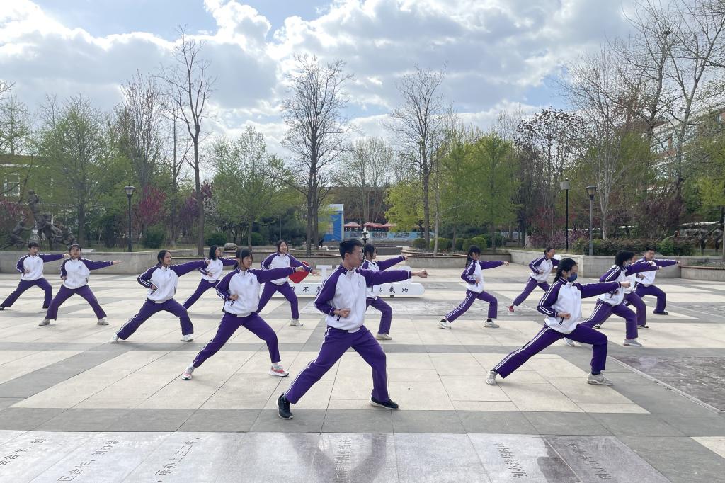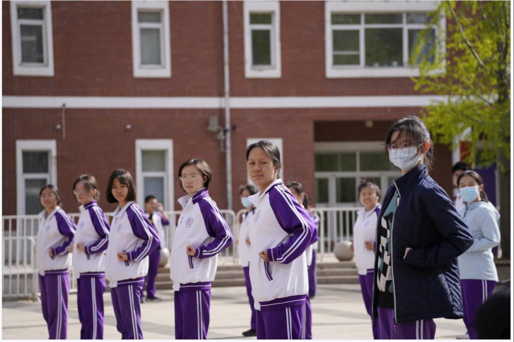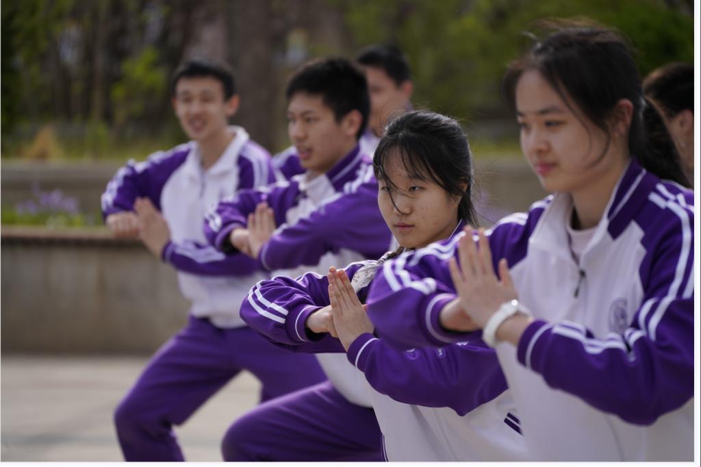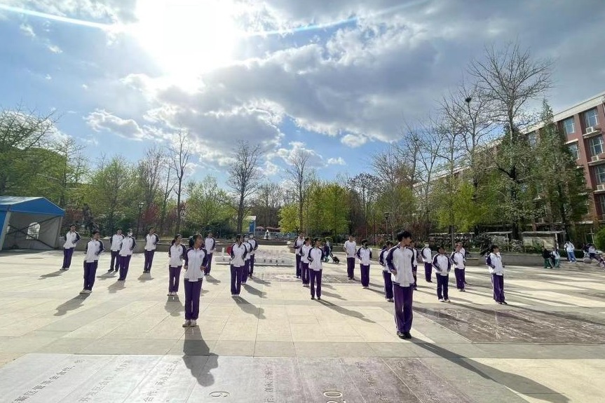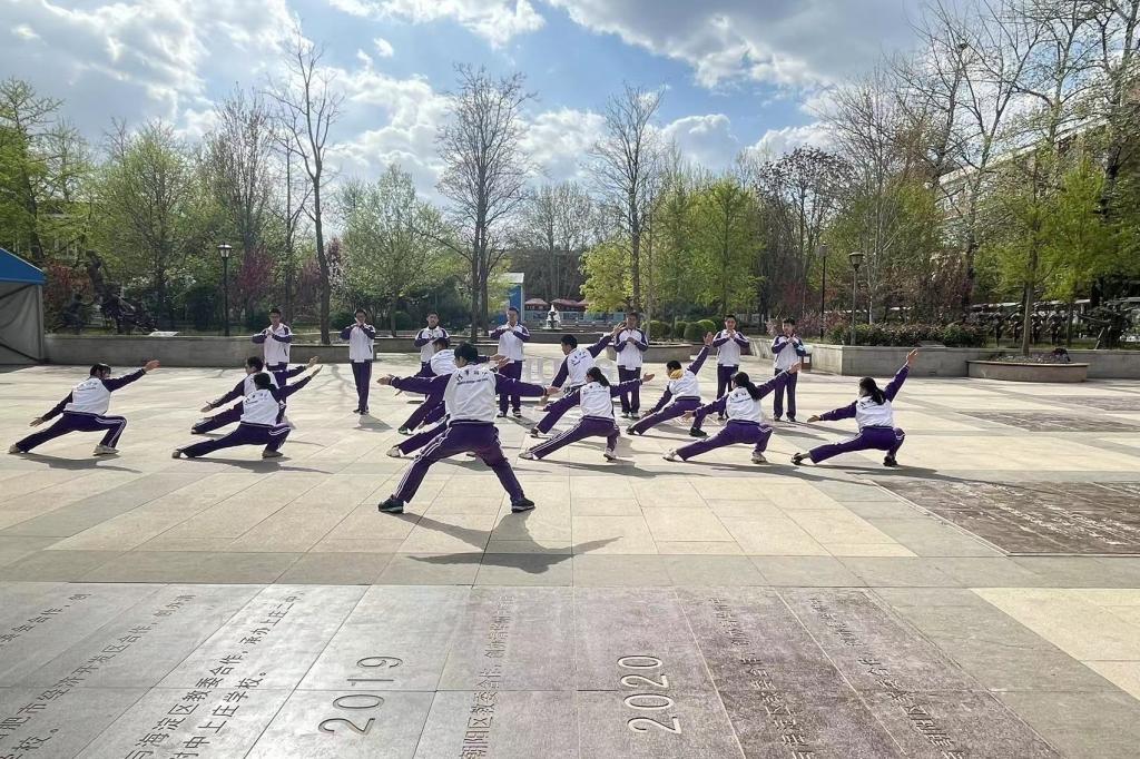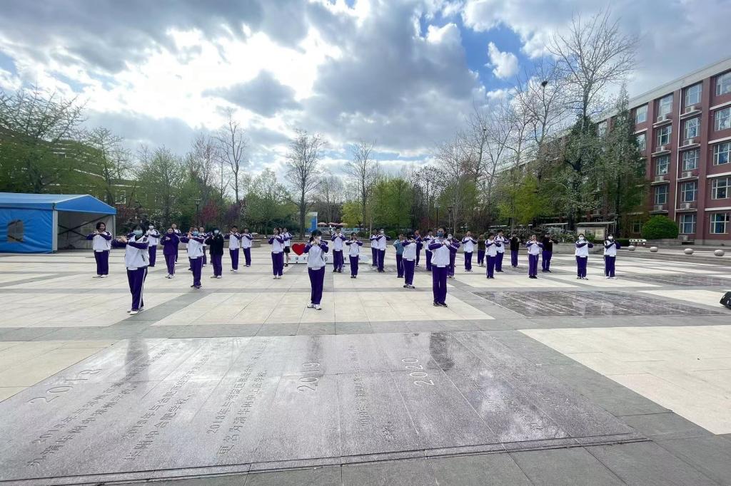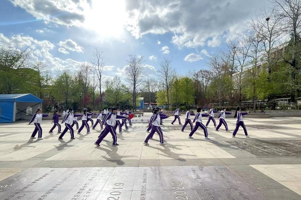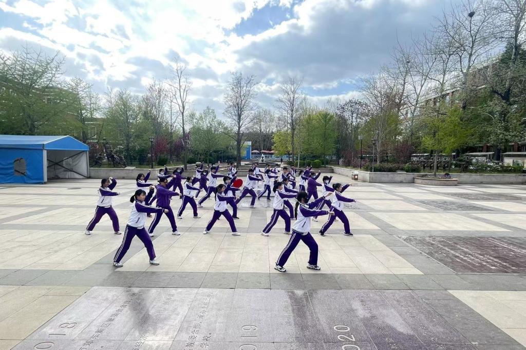 2023年4月6日,高二年级全体同学在银杏林前的下沉广场上参加了一场展现青春风采的“武林大会”,他们伴着音乐,打起形神拳,为校园带来了青春的气息。高二年级的全体教师也到场观赏表演,他们为同学们加油喝彩并投出自己心目中最佳的五个班级。高二10班的王彦鲁同学承担了解说的工作。