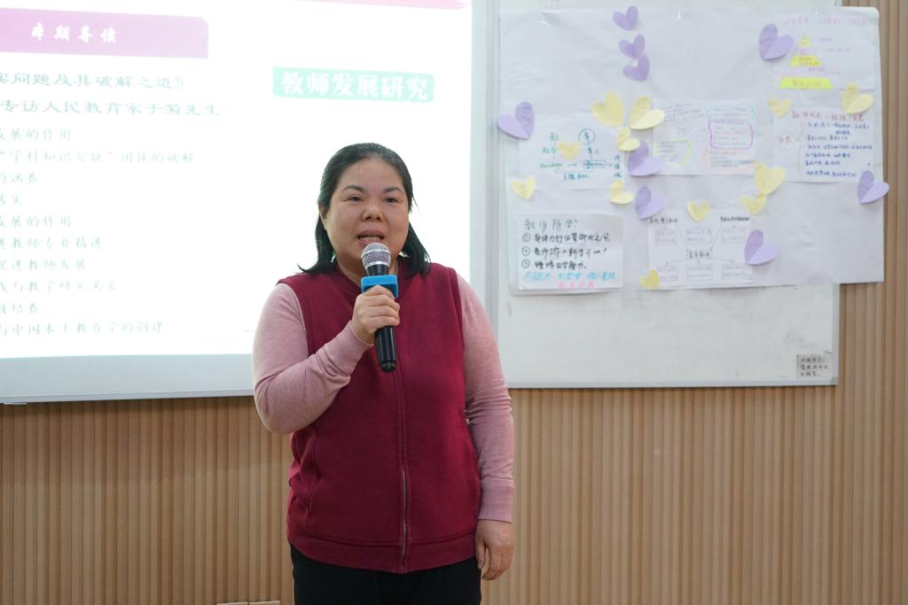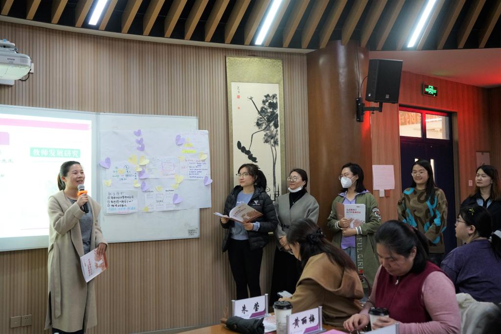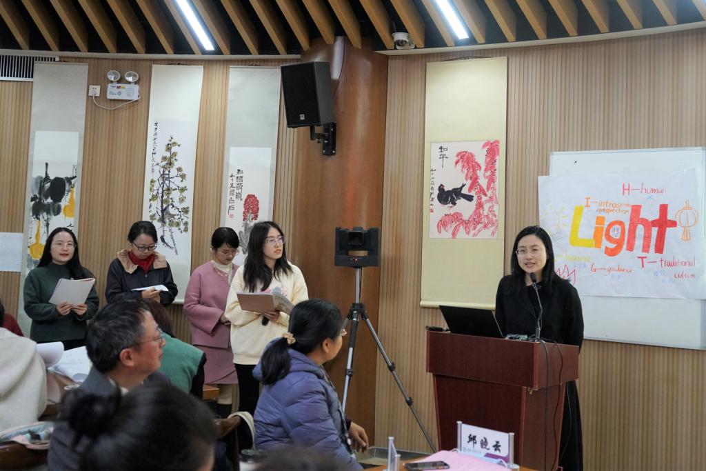 接下来,语文和英语沙龙组青年教师以小组为单位分别进行主题分享展示。汇报采用了对话访谈、主题讲座、成员心得分享等丰富多样的形式。