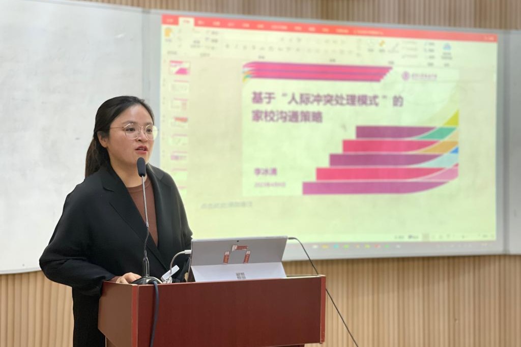 接着,李冰清老师和大家分享了家校沟通的策略。她介绍了“后疫情时代”家校工作所面临的挑战,阐释了家校冲突的合理性、普遍性、复杂性、双重性,建议老师们积极争取家庭社会共同参与育人。