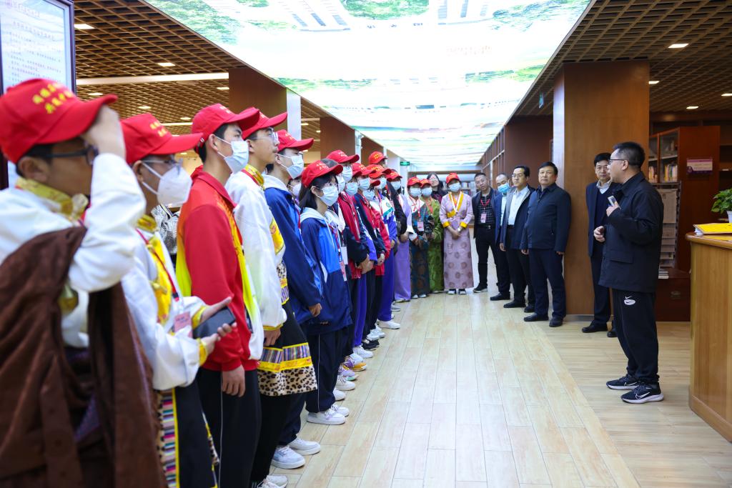 皇冠体育官网图书馆馆长万军民(右一)为甘肃师生介绍皇冠体育官网图书馆情况