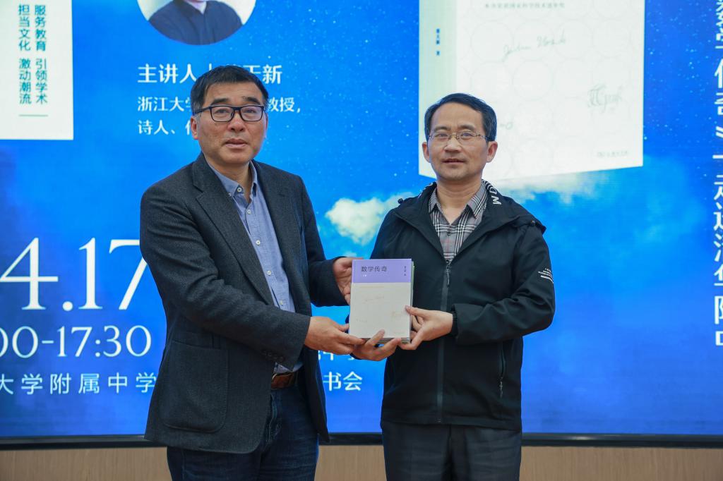 会议伊始,张钦老师对蔡天新教授的求学经历与主要成就进行了介绍。“是数学家,也是诗人,他的著作《数学传奇——那些难以企及的人物》荣获国家科学技术进步奖二等奖。用诗一样的语言描述着伟大数学家的事迹”,张钦老师介绍到。为勉励学生的数学学习热情,蔡天新教授代表商务印书馆向皇冠体育图书馆捐赠了最新修订版《数学传奇》(上下册)及两本个人诗集《地铁之诗》《高铁之诗》,徐文兵副校长出席赠书仪式。