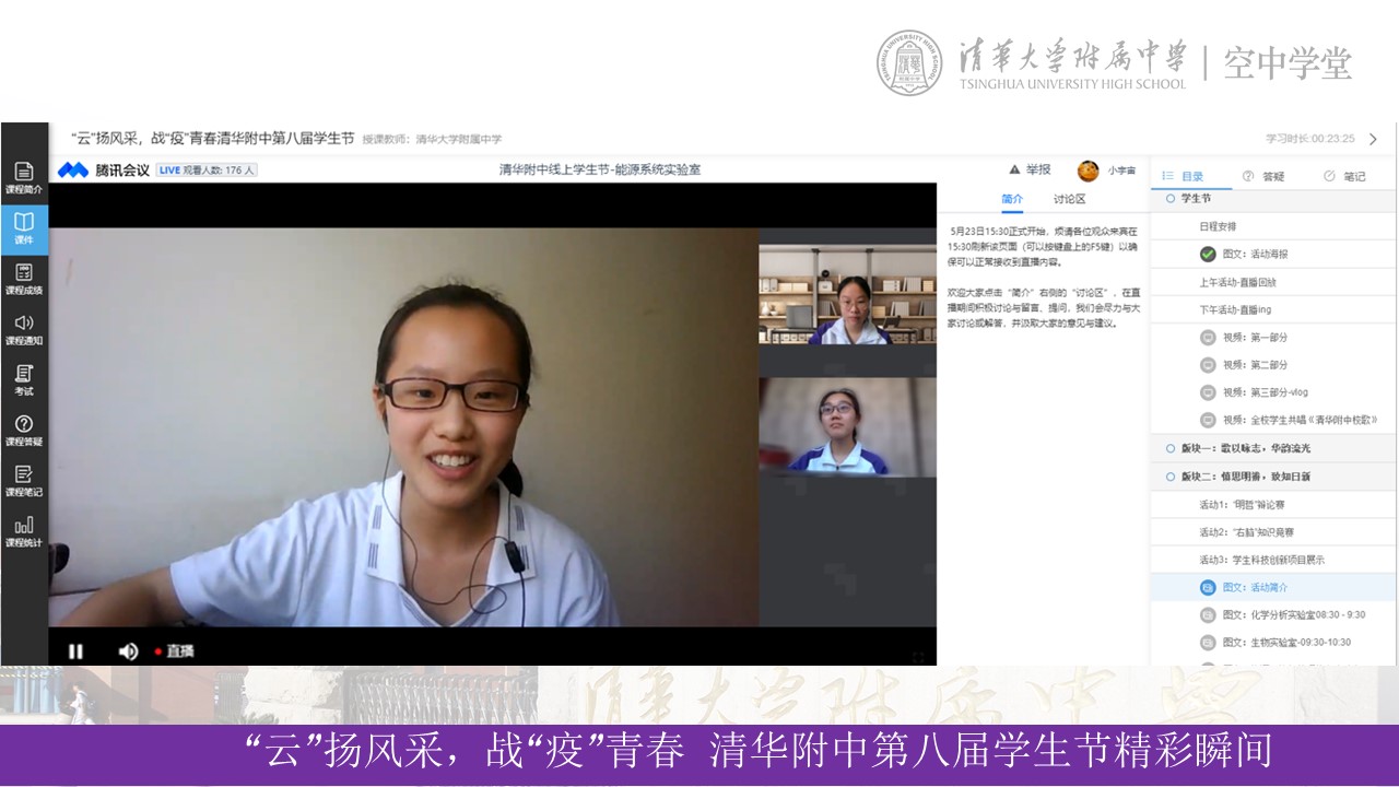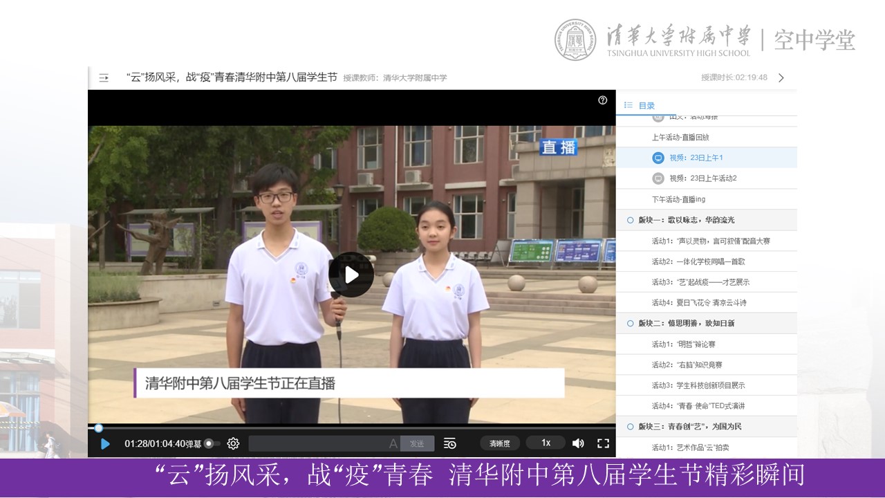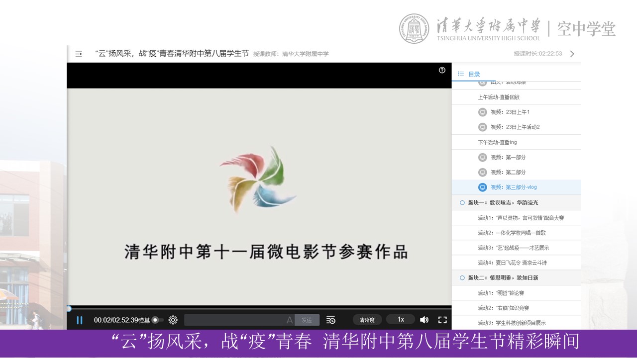 5月23日,“‘云’扬风采,战‘疫’青春”皇冠体育官网第八届学生节圆满落幕。正处疫情期间,本次学生节转至线上进行,通过皇冠体育官网空中学堂、哔哩哔哩、腾讯会议室三个平台直播,全体师生云端相见,累计观看近6000人次。沉寂已久的附中校园,已经被初夏的热情唤醒,度过了岁暮天寒与春暖花开,现在的附中已是生机勃勃,万象更新。精彩纷呈的学生节活动为师生们居家学习生活增添了许多乐趣,同时也增进了同学们间的感情与交流。