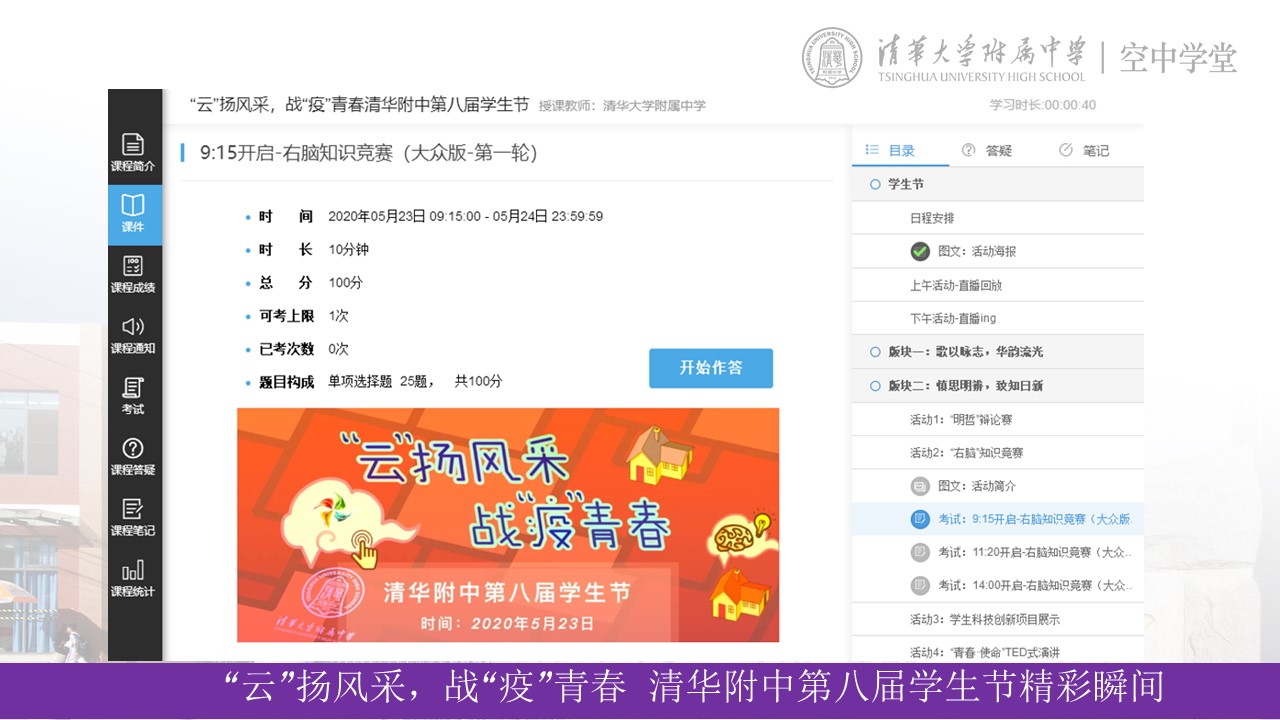 “右脑”知识竞赛也是学生节当天的一大亮点赛事,同学们通过“空中学堂”线上答题,试题涉及百科和校史知识,不仅考察参赛选手知识的深度,同样考验参赛选手们知识面的广度。这项比赛能够鼓励同学们丰富自己的课外知识,关注时事热点,更关心生活。