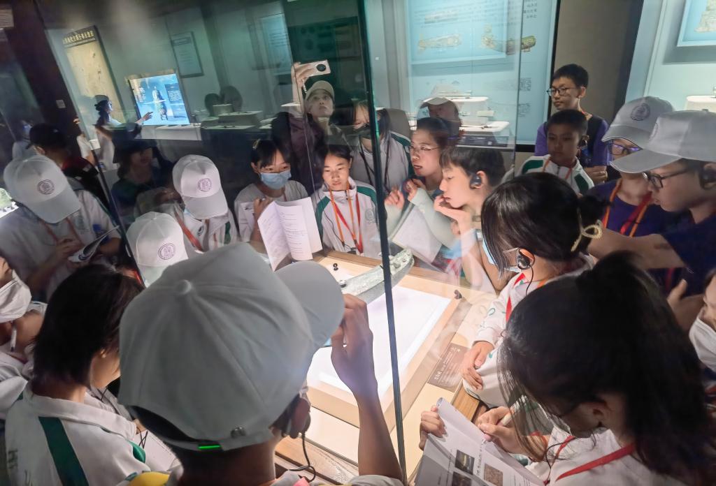 学生听讲解员介绍文物