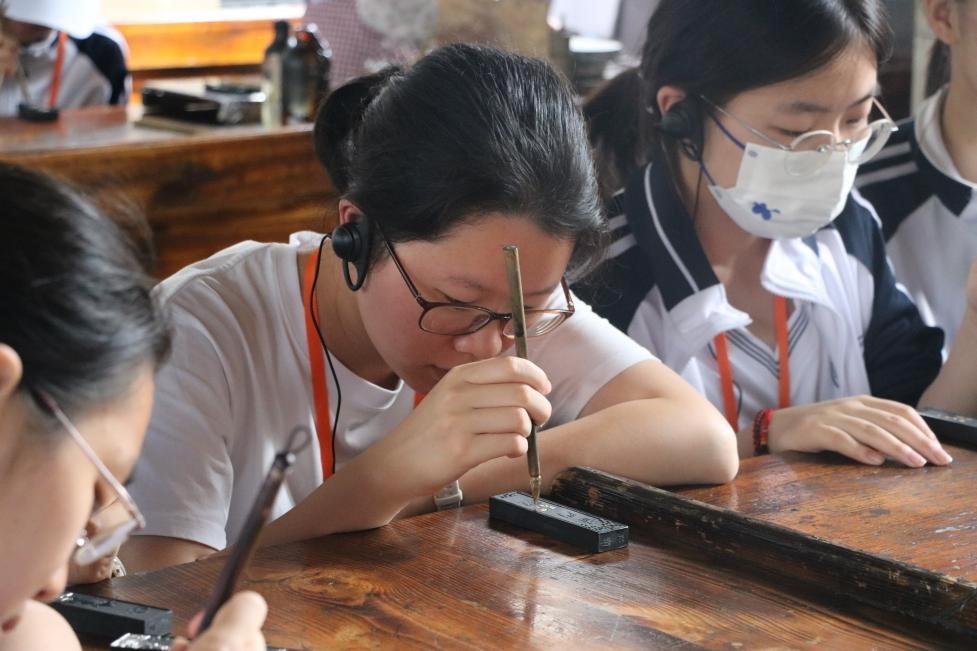 行程第四天,皇冠体育学生参观了徽墨生产车间,学习徽墨制作工艺,与非遗大师探究手工业的继承与发展并且亲自动手学习徽墨描金技艺。接着,学生们参观了徽州古城,深入了解徽州府衙的建筑格局,探索徽商起源并参观陶行知纪念馆,了解陶先生生平事迹,理解其“知行合一”的教育理念。