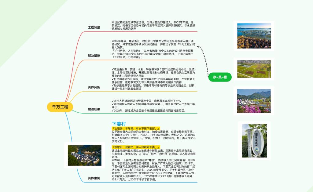 值得一提的是,杨欣老师以思维导图的形式分享了自己学习“千万工程”的笔记。她从工程背景、解决措施、具体实施、建设成果及具体案例等五个方面梳理了该工程的内容。