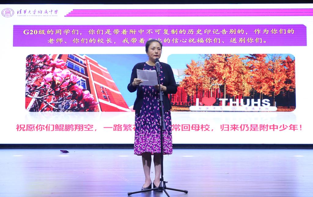 在优美的音乐声中,方妍校长徐徐走上舞台,为同学们带来了深情的毕业典礼致辞。方妍校长寄语同学们,在今后的人生道路上不畏困难,向下扎根,向上生长,百折不挠。祝愿同学们“鲲鹏翔空,一路繁花似锦,常回母校,归来仍是附中少年。”随后,方妍校长为同学们颁发毕业证书,各班班长上台领取并与校长合影留念。