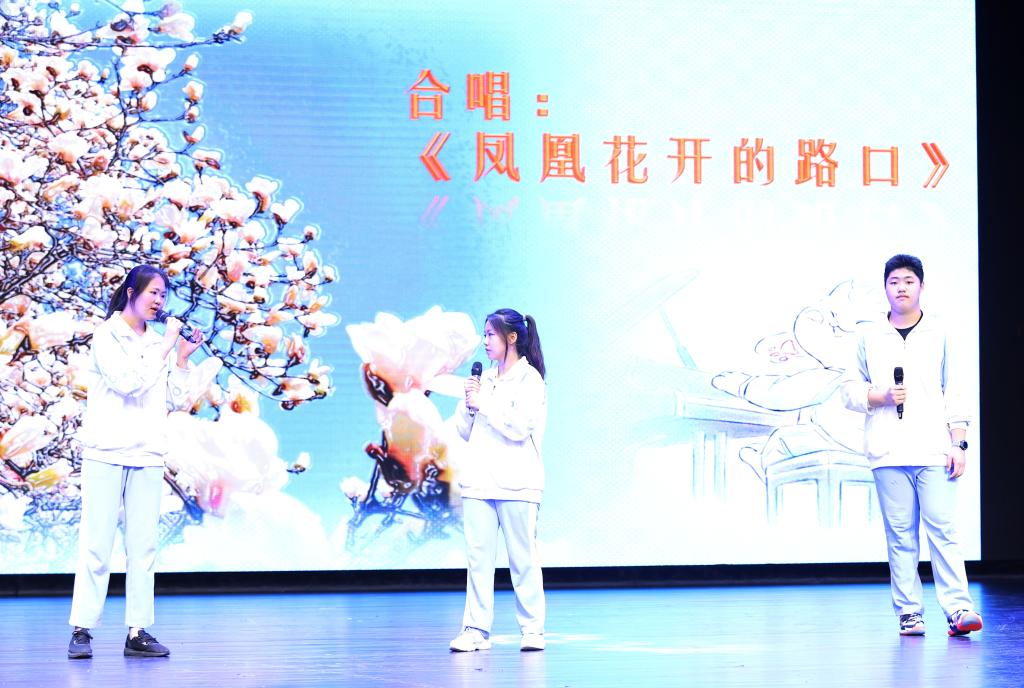 毕业典礼第三项歌曲演唱。三名演唱的同学从会场中间边唱边走向舞台,全程与周围同学频频微笑互动。一曲《凤凰花开的路口》点燃了全场激情,同学们随着音乐节奏打着节拍进行互动,场面温暖动人。
