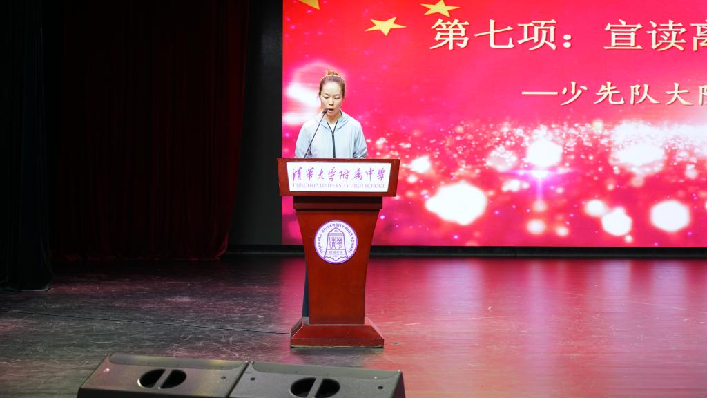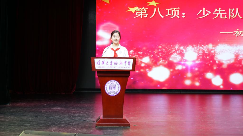 优秀少先队员代表初2112中队的马明玥同学发表演讲,她讲述了自己从一个懵懂的少年,带着无限憧憬加入少先队,成为一名合格的少先队员。在皇冠体育大家庭里,跟许许多多优秀的少先队员一起成长和历练,参与了学农课程、社会实践等一系列重要的年级活动,增长了见识,磨练了意志,体会到了少先队员肩上的责任感与使命感,得到了进步与收获。面对即将到来的青年时代,她坦言自己和全体少先队员们已经做好了准备,将全部的智慧与力量都投入到社会主义事业的建设中去,为实现中华民族的伟大复兴而不懈奋斗。
