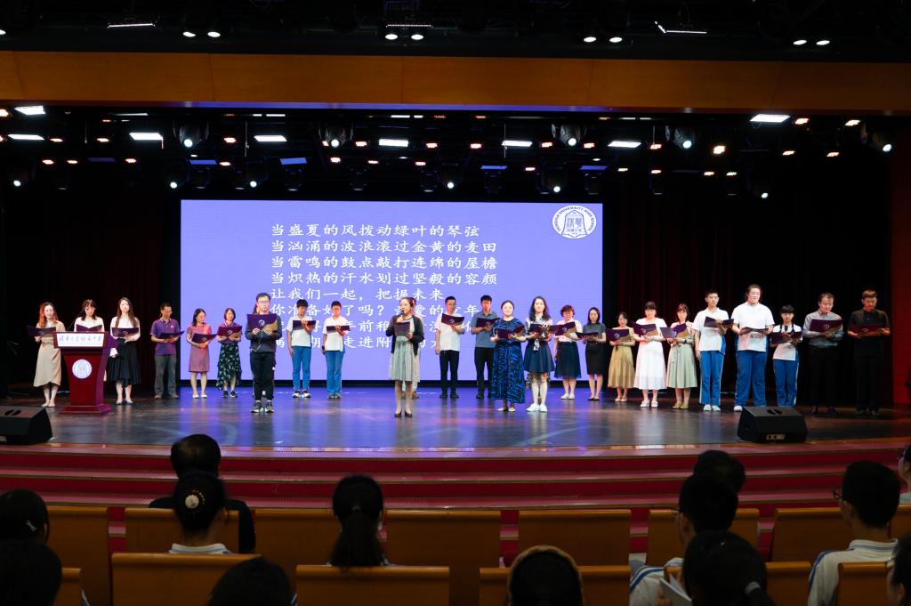 英语组苗琳达老师为初21级全体学生深情写下诗歌《未来就是今天加上理想》,由方妍校长带领初21级学部全体班主任和五名学生朗诵。两年前稚嫩青涩走入附中的孩子,如今已经身姿挺拔、目光清澈;新的征程就此开始,有亲人、伙伴、师长和学校与初21级学生并肩作战,即使紧张也可为动力,不负热爱与青春。