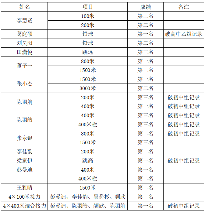 本次比赛共分为初中组和高中组两个大组别,共有来自全国120所田径传统优势项目的中学参加了此次比赛。在此次比赛中我校初中组以198分的成绩获得初中组学校团体总分第一名,高中组获得团体总分第六名,学校总分第一名。此次比赛中,参赛运动员均获得了优异的成绩。