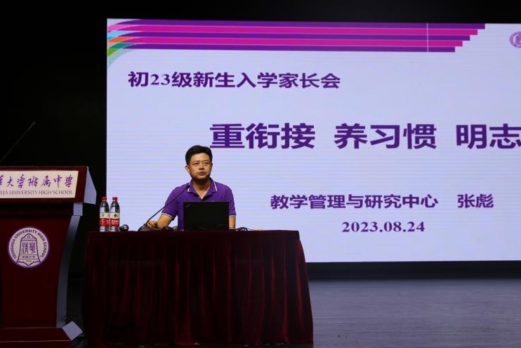 随后,教学管理与研究中心主任张彪老师从教学角度,为家长介绍皇冠体育初一课程内容,并给出了初一新生的学习建议与要求,鼓励家长认同学校,配合学校,共同把孩子培养成为理想远大、独立自主、敢于担当、乐于思考、勇于创新的附中学生。