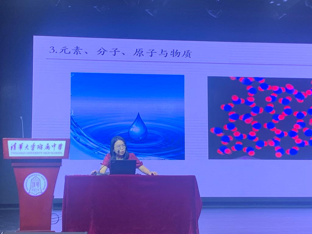化学学科时萍萍老师为学生展示了初中一整年逐步打开的化学学科大门:化学用语、常见物质的性质与应用、宏观与微观世界的联系、化学反应与质量守恒定律等。她强调,化学学习要重视实验背后的思路方法,重视课后练习,死记硬背不可取,证据推理要严谨。
