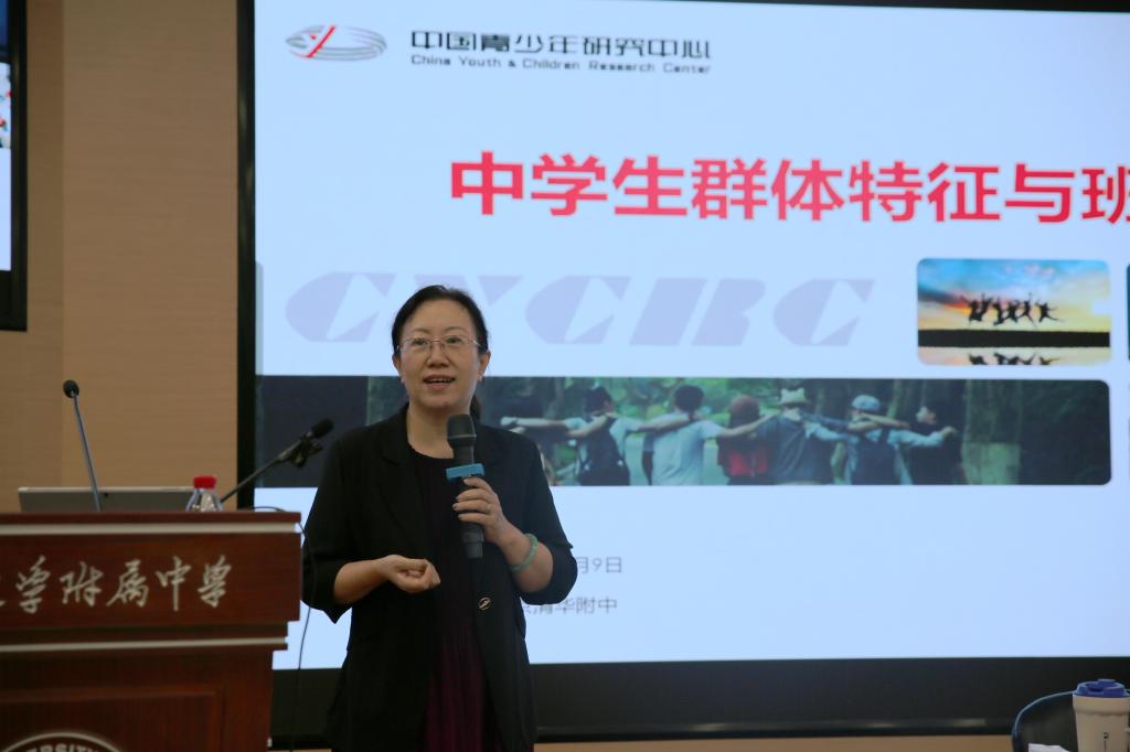 中国青少年研究中心孙宏艳所长作专家报告,孙老师以详实的统计数据、生动活泼的案例与大家分享中学生群体特征,“互联网一代、理性自我的一代、偶像榜样高度融合的一代、和谐矛盾并存的一代”等概括为当代中学生做出生动画像,为老师们更理性、深入地理解中学生的思想与心理特点提供理论依据。同时,孙老师还从“关系、魅力、服务、习惯”这四个方面提出了她对做好班主任工作的思考。好的关系胜过好的教育,她以多年研究数据对比向老师展示重视师生关系的重要性,教师还应不断提升自我人格魅力,引导学生养成良好行为习惯,做好学生引路人、守护人与筑梦人。孙老师深入浅出的报告启发在座的老师们在未来能更深入、更有针对性地开展德育工作。