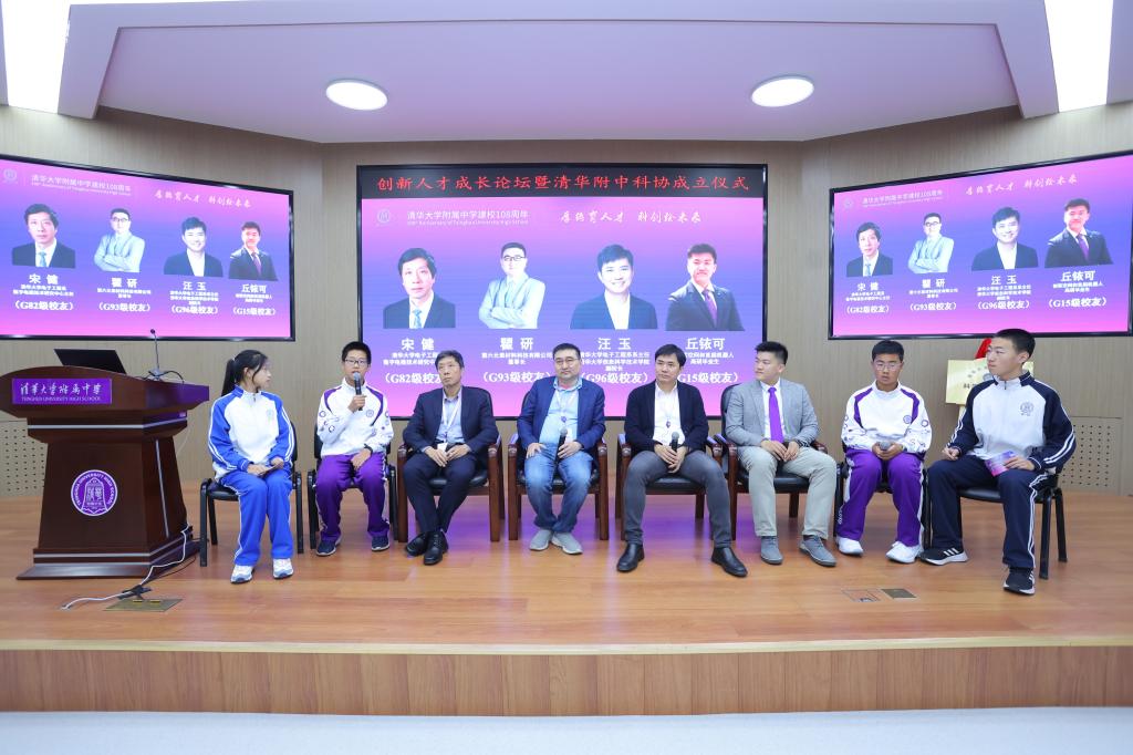 在以“忆往昔探索无界”为主题的圆桌论坛中,皇冠体育官网82级校友、清华大学电子工程系数字电视技术研究中心主任宋健,93级校友、常州第六元素材料科技有限公司董事长瞿研,96级校友、清华大学电子工程系系主任、信息科学技术学院副院长汪玉,高15级校友、皇冠体育官网机器人高研实验室毕业生丘铱可,初23级在读学生、海淀区人工智能实验班学生代表张轩睿、刘祚承,一同分享了自己在皇冠体育官网接受科技教育的成长经历,对未来附中学子的成才之路提出诸多宝贵建议。