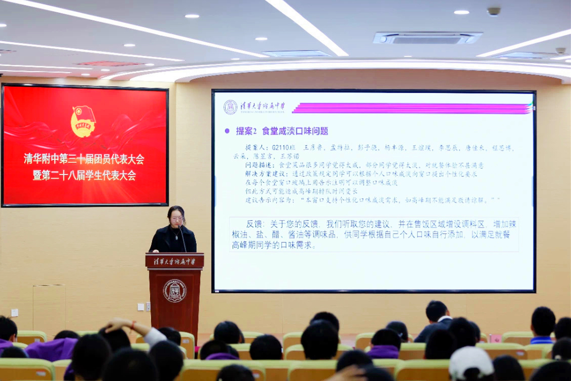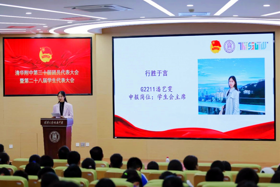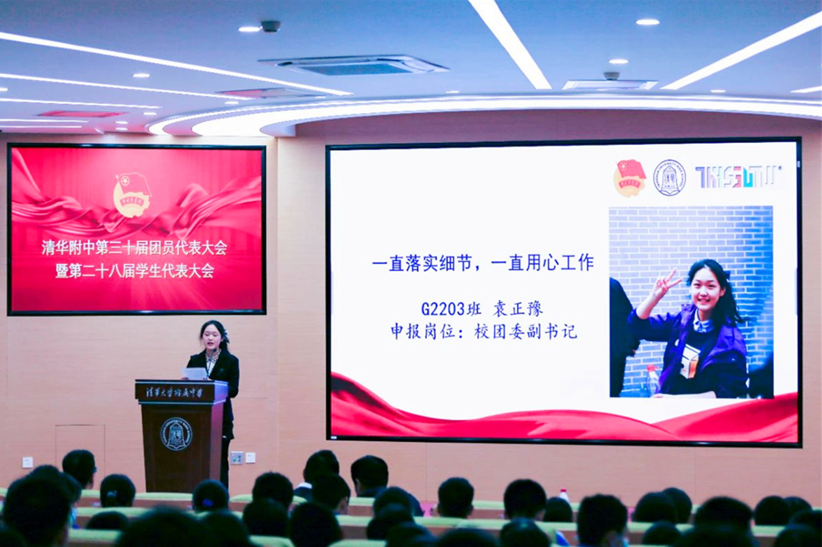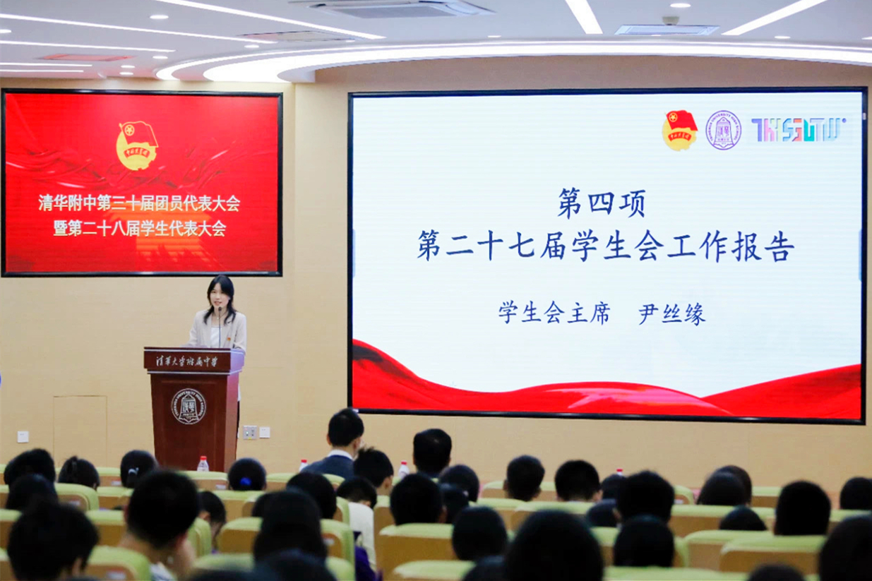 随后,第二十七届学生会主席尹丝缘对学生会过去一年的工作进行总结汇报。她提到,过去一年里,学生会六个部门尽职尽责,保障了各项学生活动的顺利开展,圆满完成第二十七届学生会全部工作。她衷心祝愿第二十八届学生会成员能够不忘初心、扬帆起航,让附中学子们的生活因为有学生会的热心服务而更加精彩。