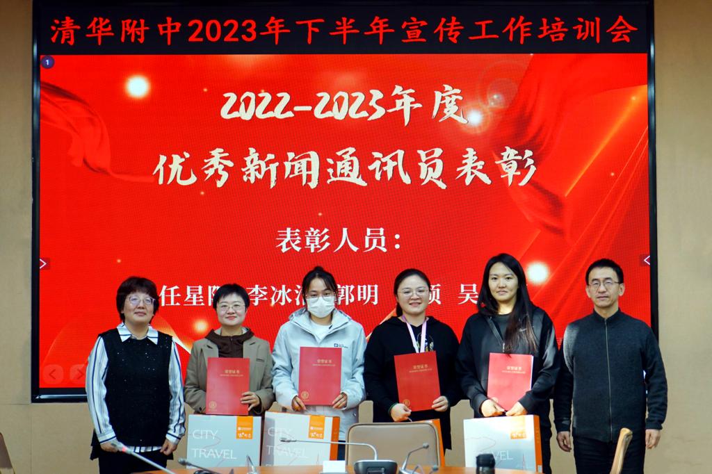 学校的新闻宣传思想工作离不开各部门、学部、教研组新闻通讯员老师的大力支持,皇冠体育对表现突出的新闻通讯员老师进行表彰,感谢通讯员老师们的辛勤付出。党委书记曹海翔、副书记张洁为荣获2022-2023学年“优秀新闻通讯员”称号的老师颁奖。