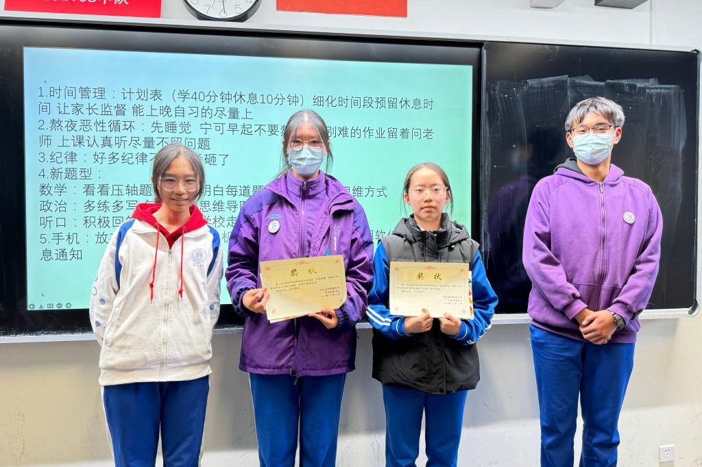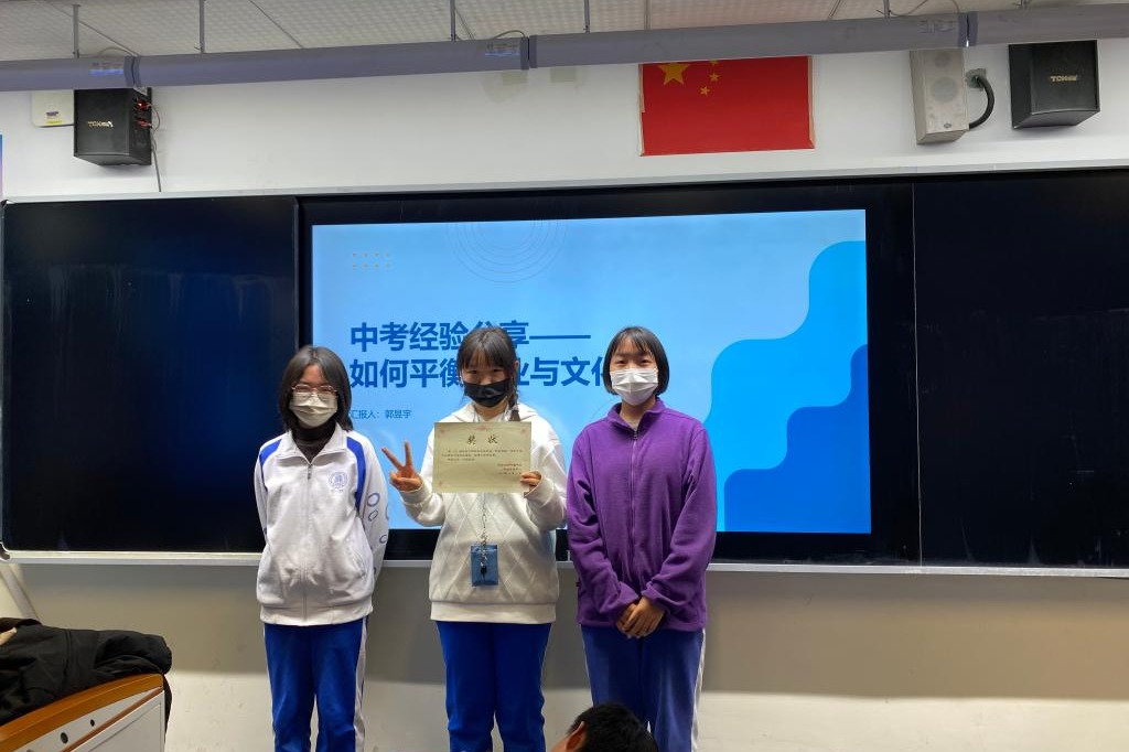 高2312班学姐从学习方法、时间分配与心理调节三方面给初2115班进行经验介绍。学姐说,初三的学习生活紧张而纯粹,在学习中要会学、乐学并持之以恒。在生活中要热爱生活,珍惜与老师、同学、家长的相处,相互扶持,携手共进。