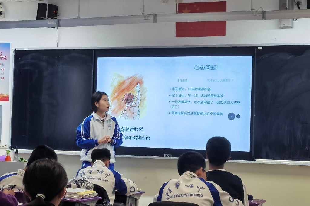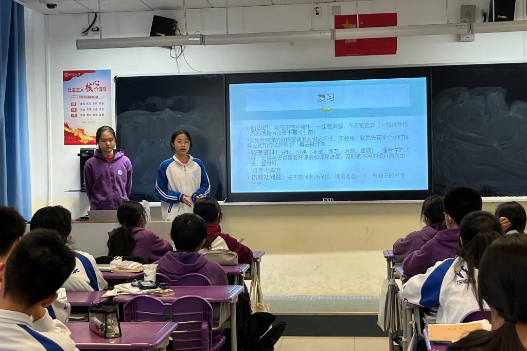 高2309班学姐进初2109班上了一节与众不同的班会课。两位学姐分享初三的心得:要遵循最底层的逻辑来学习,要让自己的潜意识积极向上。最重要的是保证课内的知识全部掌握并积极答疑。
