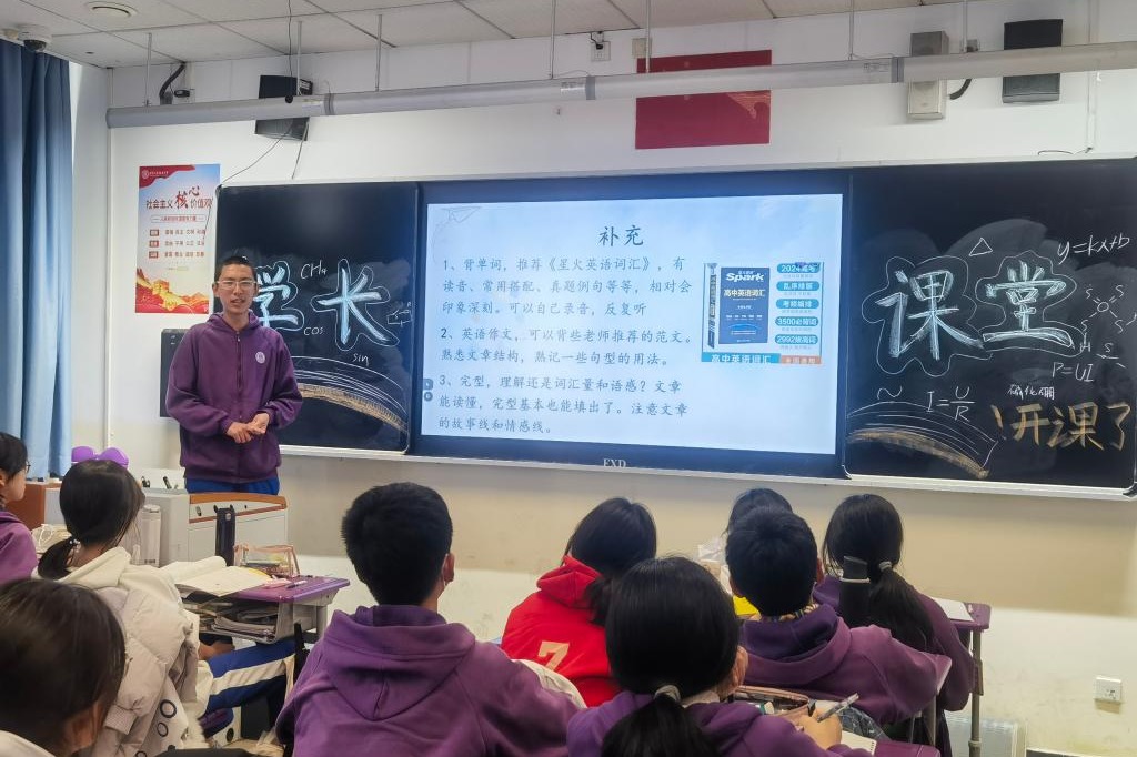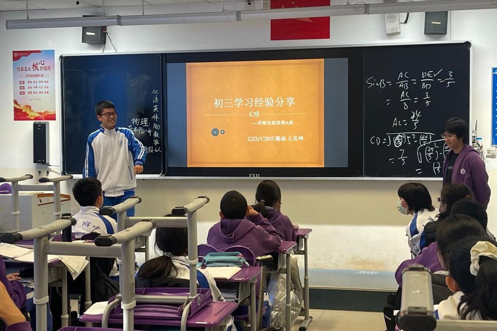 高2314班学长向初2117班分享了自己在初三的学习过程和学习经验,在课内学习、课外拓展等多方面进行了生动、细致的讲解。